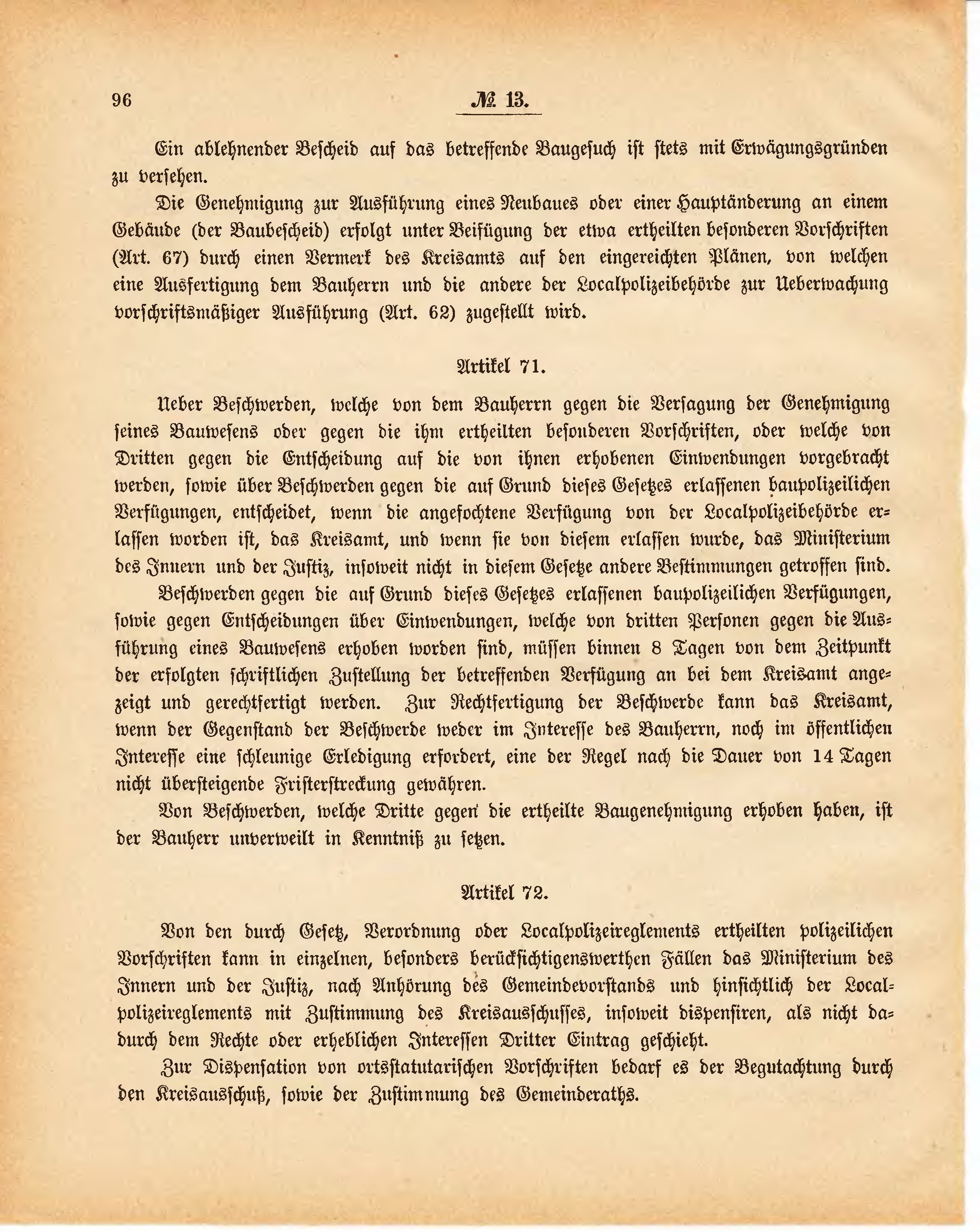 Von den durch Gesetz, Verordnung oder Localpolizeireglements ertheilten polizeilichen Vorschriften kann in einzelnen, besonders berücksichtigenswerthen Fällen das Ministerium des Innern und der Justiz, nach Anhörung des Gemeindevorstands und hinsichtlich der Localpolizeireglements mit Zustimmung des Kreisausschusses, insoweit dispensiren, als nicht dadurch dem Rechte oder erheblichen Interessen Dritter Eintrag geschieht.