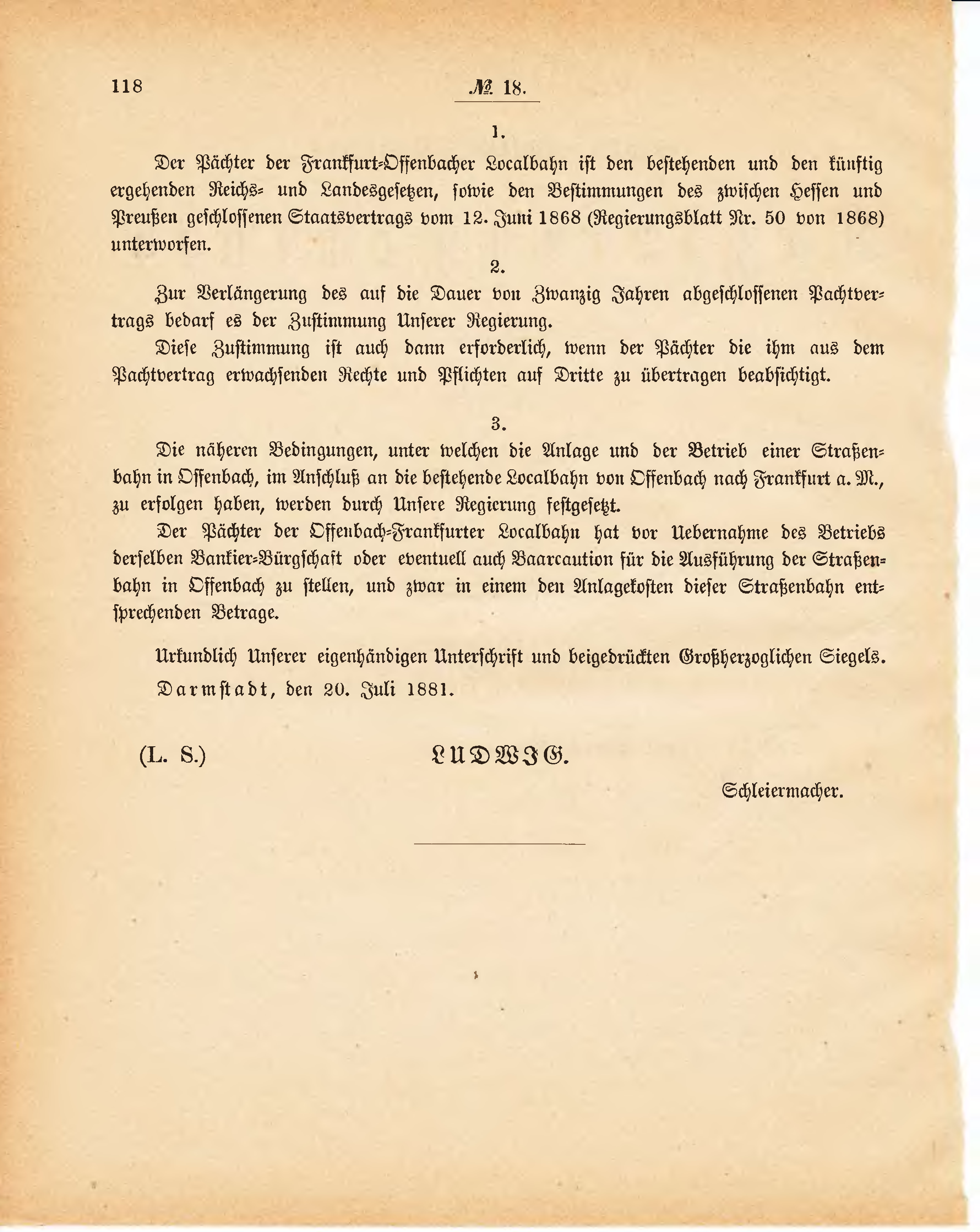 Der Pächter der Frankfurt-Offenbacher Localbahn ist den bestehenden und den künftig ergehenden Reichs- und Landesgesetzen, sowie den Bestimmungen des zwischen Hessen und Preußen geschlossenen Staatsvertrags vom 12. Juni 1868 (Regierungsblatt Nr. 50 von 1868) unterworfen.