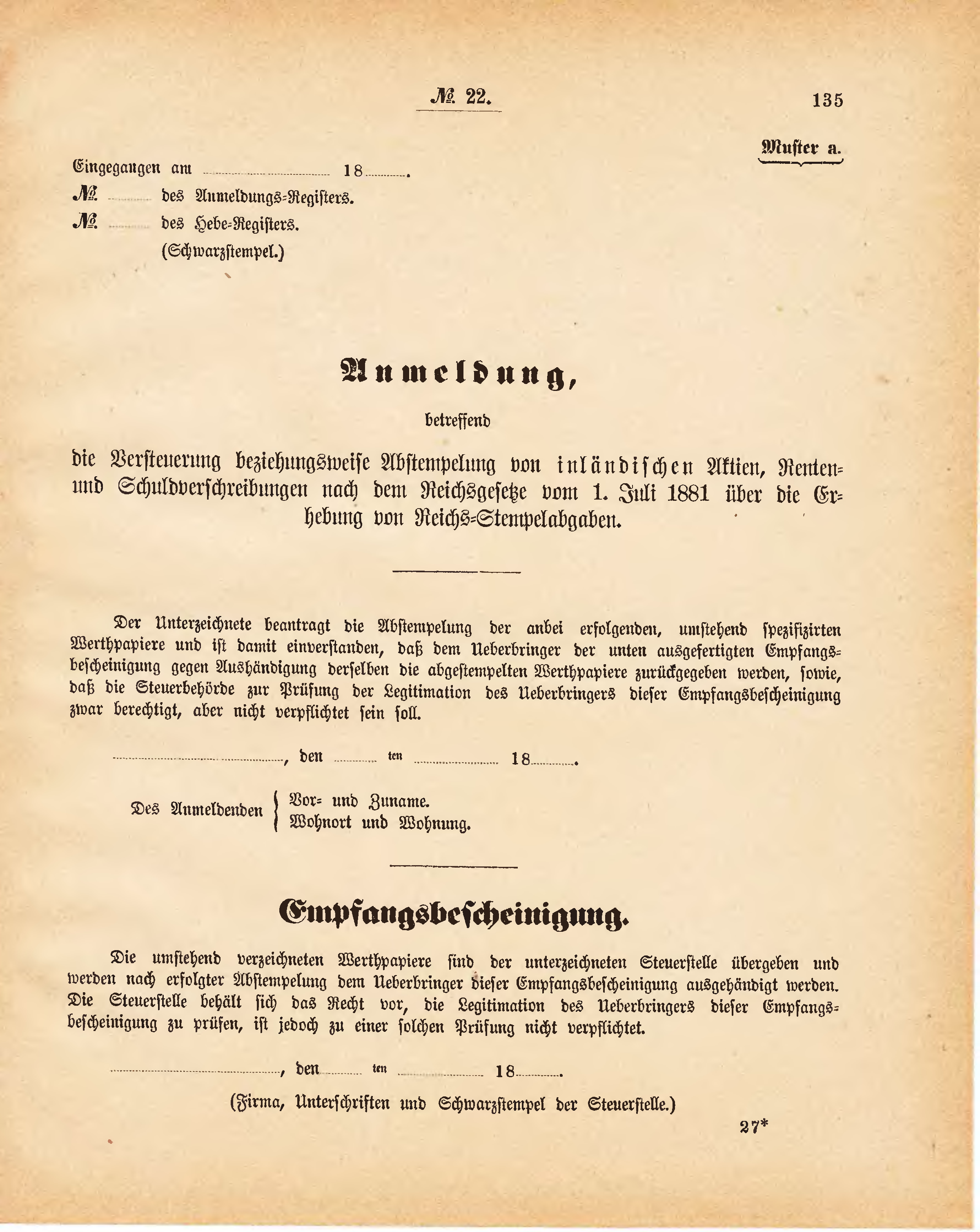Der Unterzeichnete beantragt die Abstempelung der anbei erfolgenden, umstehend spezifizirten Werthpapiere und ist damit einverstanden, daß dem Ueberbringer der unten ausgefertigten Empfangsbescheinigung gegen Aushändigung derselben die abgestempelten Werthpapiere zurückgegeben werden, sowie, daß die Steuerbehörde zur Prüfung der Legitimation des Ueberbringers dieser Empfangsbescheinigung zwar berechtigt, aber nicht verpflichtet sein soll.