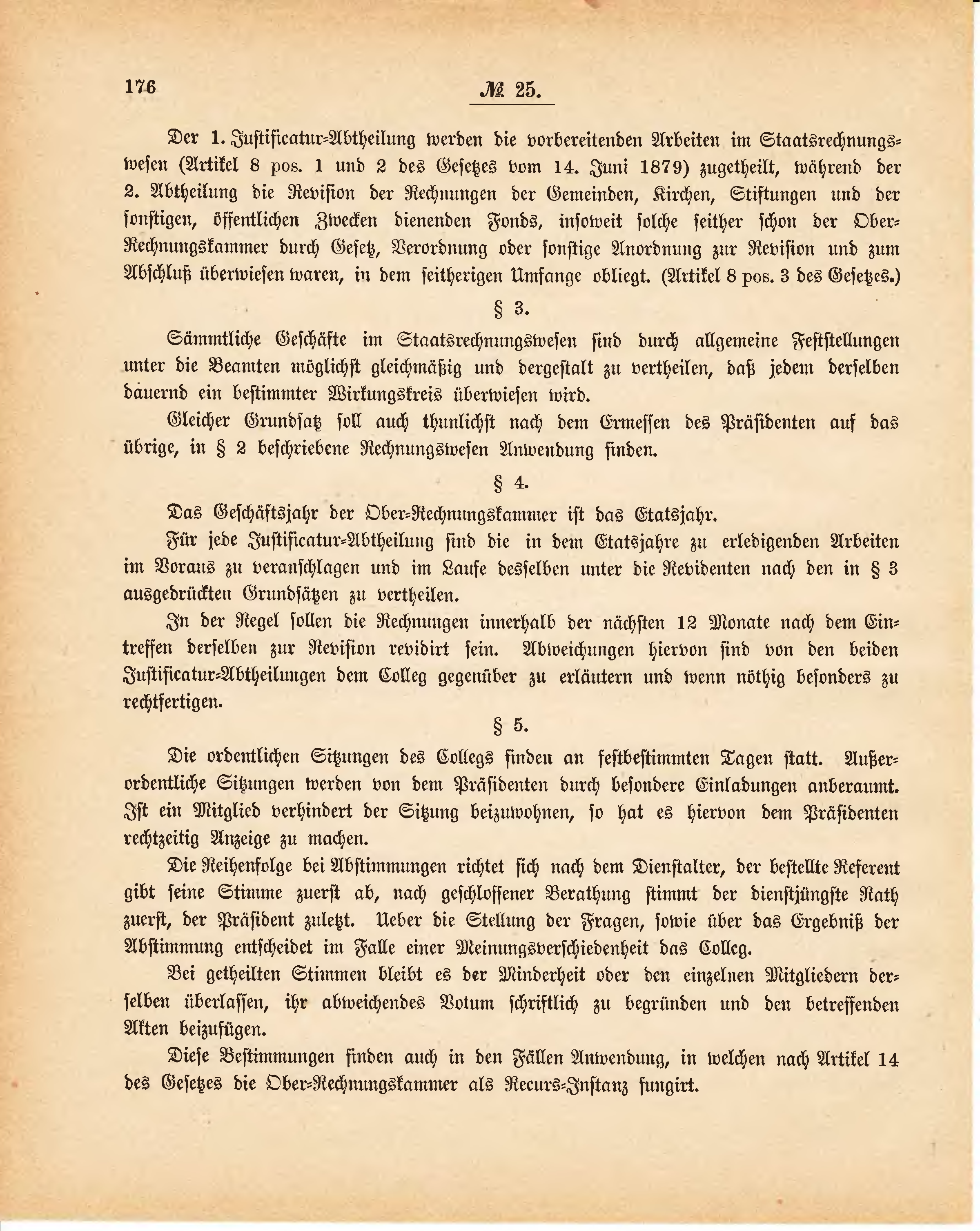 Der 1. Justificatur-Abtheilung werden die vorbereitenden Arbeiten im Staatsrechnungswesen (Artikel 8 pos. 1 und 2 des Gesetzes vom 14. Juni 1879) zugetheilt, während der 2. Abtheilung die Revision der Rechnungen der Gemeinden, Kirchen, Stiftungen und der sonstigen, öffentlichen Zwecken dienenden Fonds, insoweit solche seither schon der Ober-Rechnungskammer durch Gesetz, Verordnung oder sonstige Anordnung zur Revision und zum Abschluß überwiesen waren, in dem seitherigen Umfange obliegt. (Artikel 8 pos. 3 des Gesetzes.)