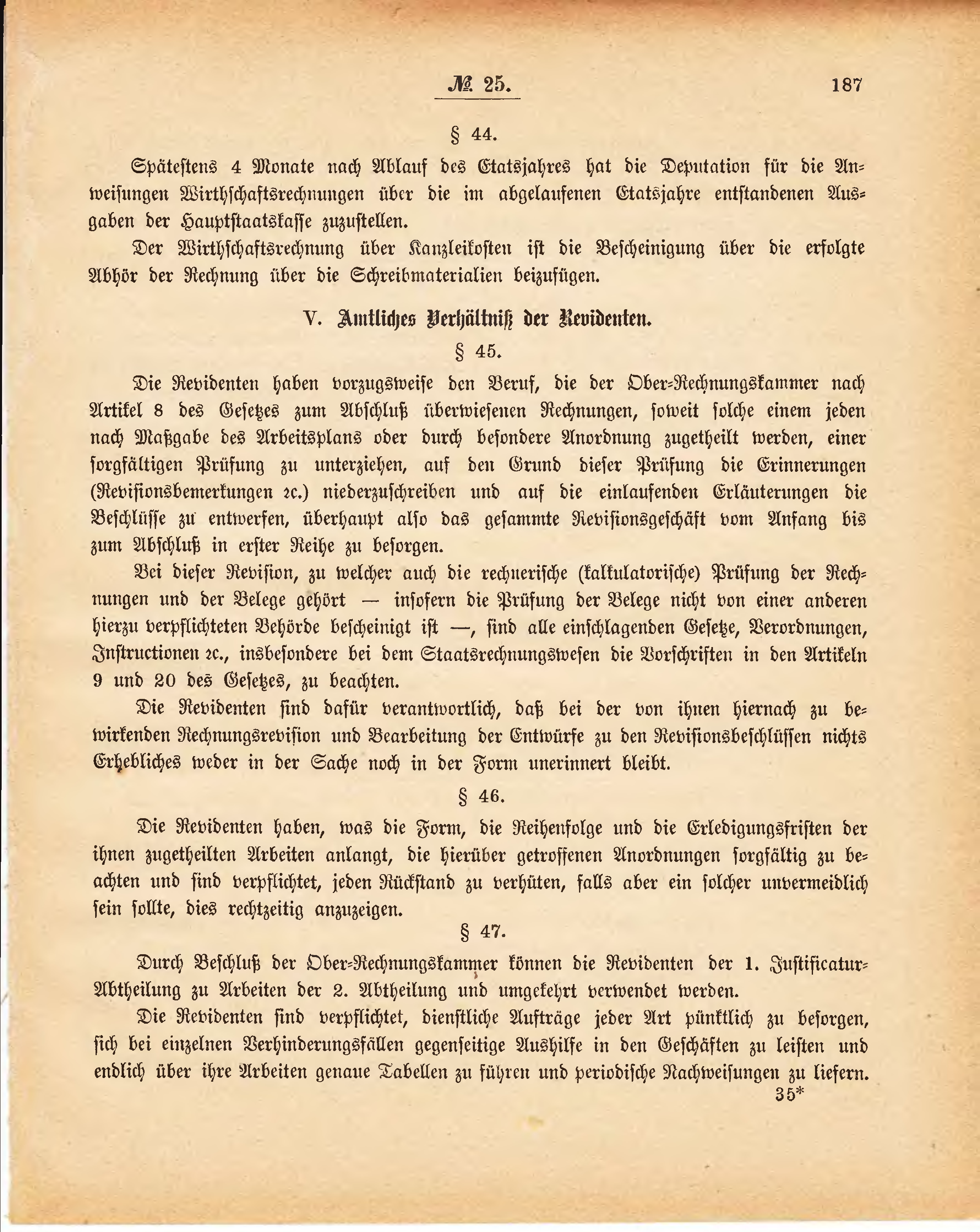 Die Revidenten haben vorzugsweise den Beruf, die der Ober-Rechnungskammer nach Artikel 8 des Gesetzes zum Abschluß überwiesenen Rechnungen, soweit solche einem jeden nach Maßgabe des Arbeitsplans oder durch besondere Anordnung zugetheilt werden, einer sorgfältigen Prüfung zu unterziehen, auf den Grund dieser Prüfung die Erinnerungen (Revisionsbemerkungen etc.) niederzuschreiben und auf die einlaufenden Erläuterungen die Beschlüsse zu entwerfen, überhaupt also das gesammte Revisionsgeschäft vom Anfang bis zum Abschluß in erster Reihe zu besorgen.