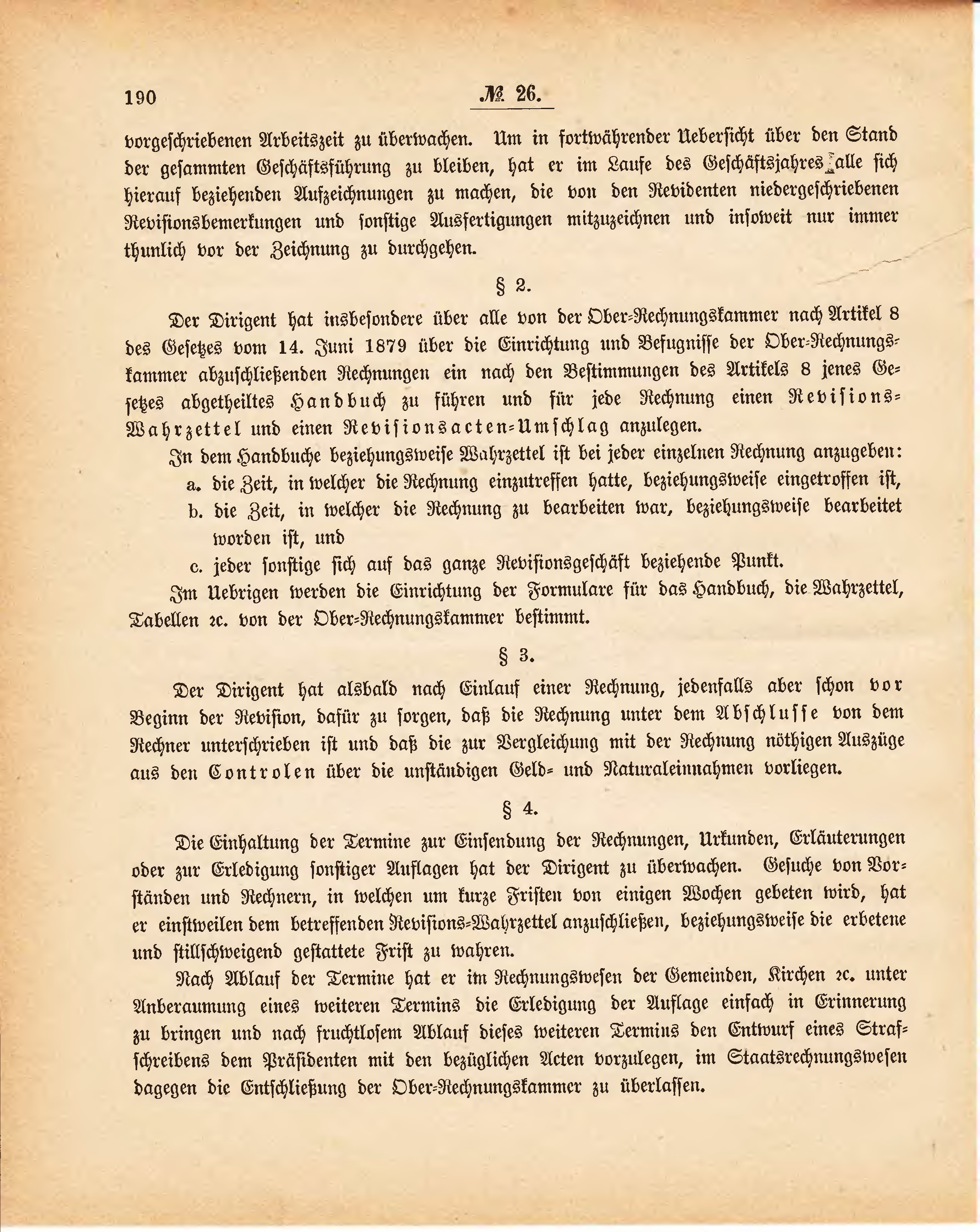 Der Dirigent hat insbesondere über alle von der Ober-Rechnungskammer nach Artikel 8 des Gesetzes vom 14. Juni 1879 über die Einrichtung und Befugnisse der Ober-Rechnungskammer abzuschließenden Rechnungen ein nach den Bestimmungen des Artikels 8 jenes Gesetzes abgetheiltes Handbuch zu führen und für jede Rechnung einen Revisions-Wahrzettel und einen Revisionsacten-Umschlag anzulegen.