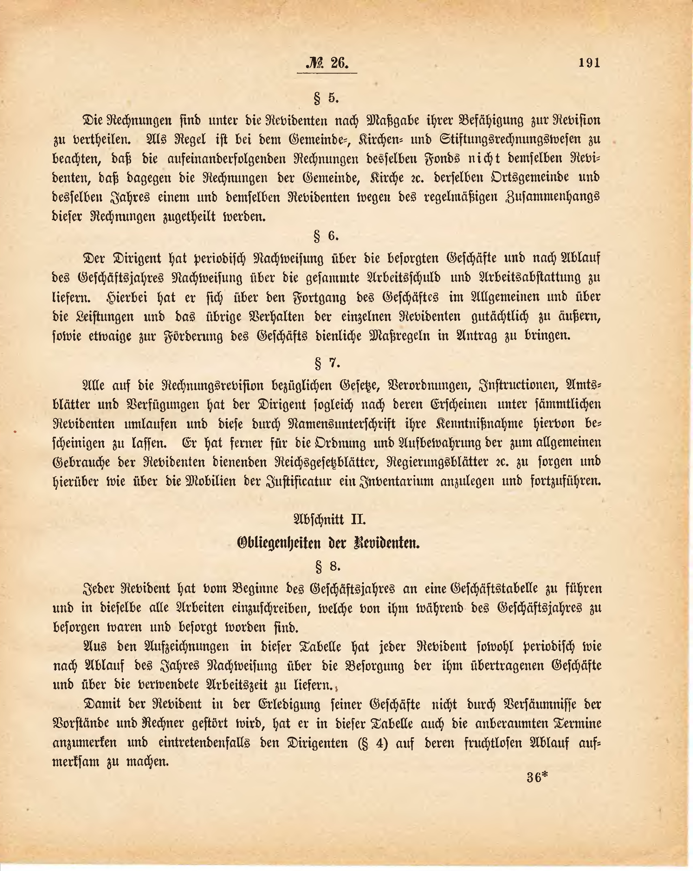 Alle auf die Rechnungsrevision bezüglichen Gesetze, Verordnungen, Instructionen, Amtsblätter und Verfügungen hat der Dirigent sogleich nach deren Erscheinen unter sämmtlichen Revidenten umlaufen und diese durch Namensunterschrift ihre Kenntnißnahme hiervon bescheinigen zu lassen. Er hat ferner für die Ordnung und Aufbewahrung der zum allgemeinen Gebrauche der Revidenten dienenden Reichsgesetzblätter, Regierungsblätter etc. zu sorgen und hierüber wie über die Mobilien der Justificatur ein Inventarium anzulegen und fortzuführen.