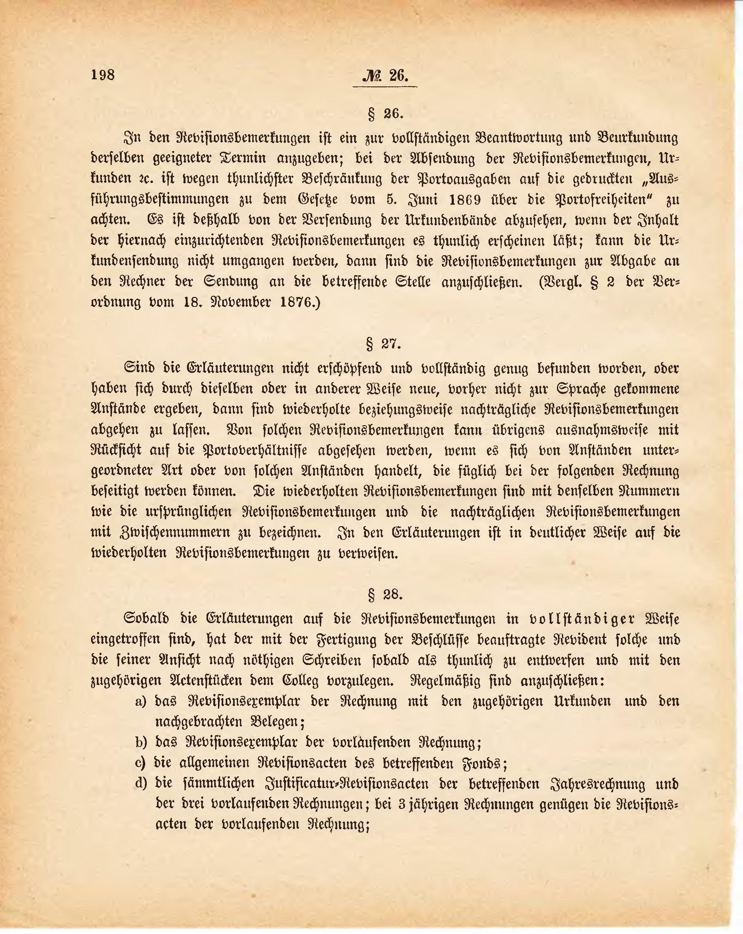 In den Revisionsbemerkungen ist ein zur vollständigen Beantwortung und Beurkundung derselben geeigneter Termin anzugeben; bei der Absendung der Revisionsbemerkungen, Urkunden etc. ist wegen thunlichster Beschränkung der Portoausgaben auf die gedruckten "Ausführungsbestimmungen zu dem Gesetze vom 5. Juni 1869 über die Portofreiheiten" zu achten. Es ist deßhalb von der Versendung der Urkundenbände abzusehen, wenn der Inhalt der hiernach einzurichtenden Revisionsbemerkungen es thunlich erscheinen läßt; kann die Urkundensendung nicht umgangen werden, dann sind die Revisionsbemerkungen zur Abgabe an den Rechner der Sendung an die betreffende Stelle anzuschließen. (Vergl. § .2 der Verordnung vom 18. November 1876.)