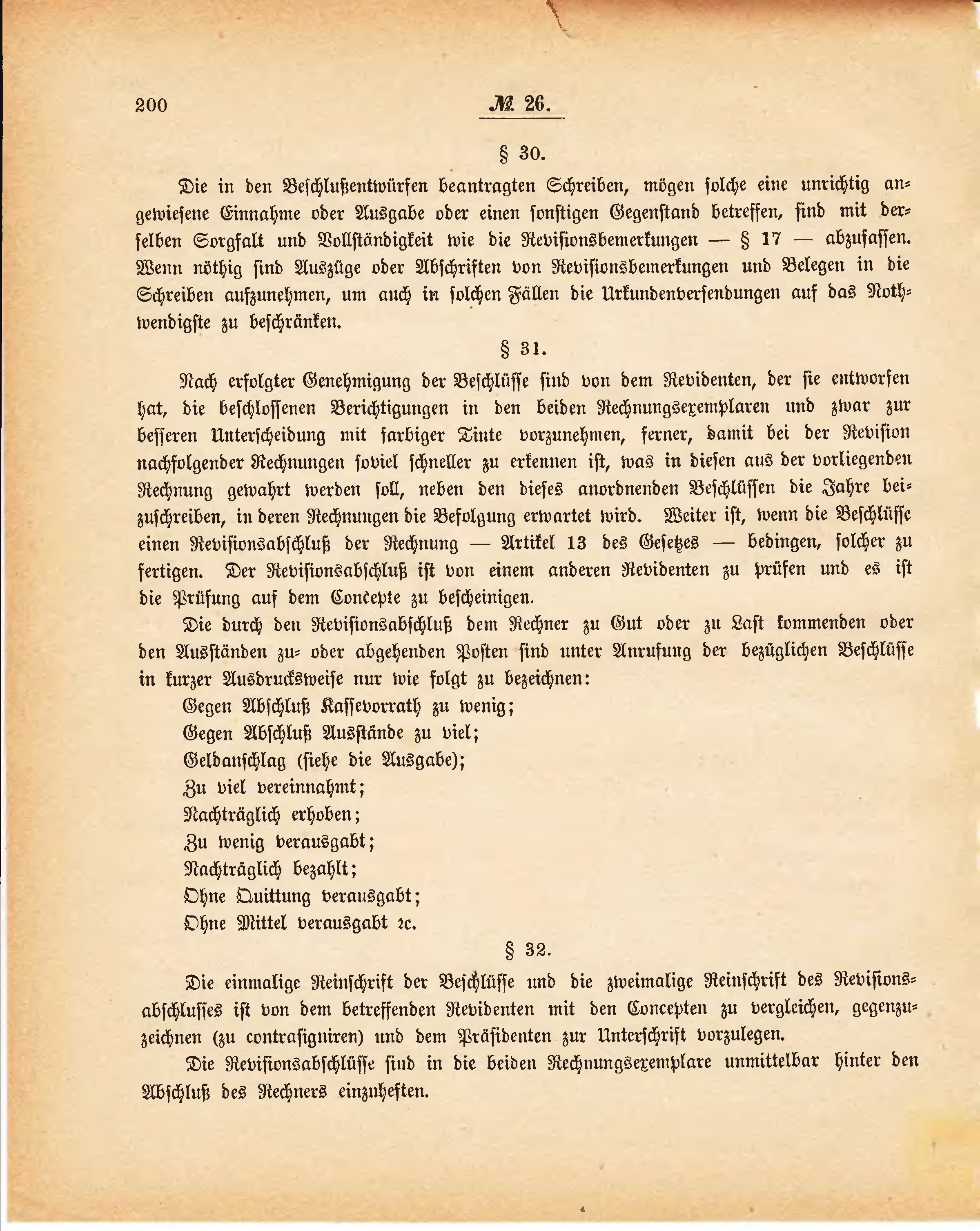 Nach erfolgter Genehmigung der Beschlüsse sind von dem Revidenten, der sie entworfen hat, die beschlossenen Berichtigungen in den beiden Rechnungsexemplaren und zwar zur besseren Unterscheidung mit farbiger Tinte vorzunehmen, ferner, damit bei der Revision nachfolgender Rechnungen soviel schneller zu erkennen ist, was in diesen aus der vorliegenden Rechnung gewahrt werden soll, neben den dieses anordnenden Beschlüssen die Jahre beizuschreiben, in deren Rechnungen die Befolgung erwartet wird. Weiter ist, wenn die Beschlüsse einen Revisionsabschluß der Rechnung - Artikel 13 des Gesetzes - bedingen, solcher zu fertigen. Der Revisionsabschluß ist von einem anderen Revidenten zu prüfen und es ist die Prüfung auf dem Concepte zu bescheinigen.