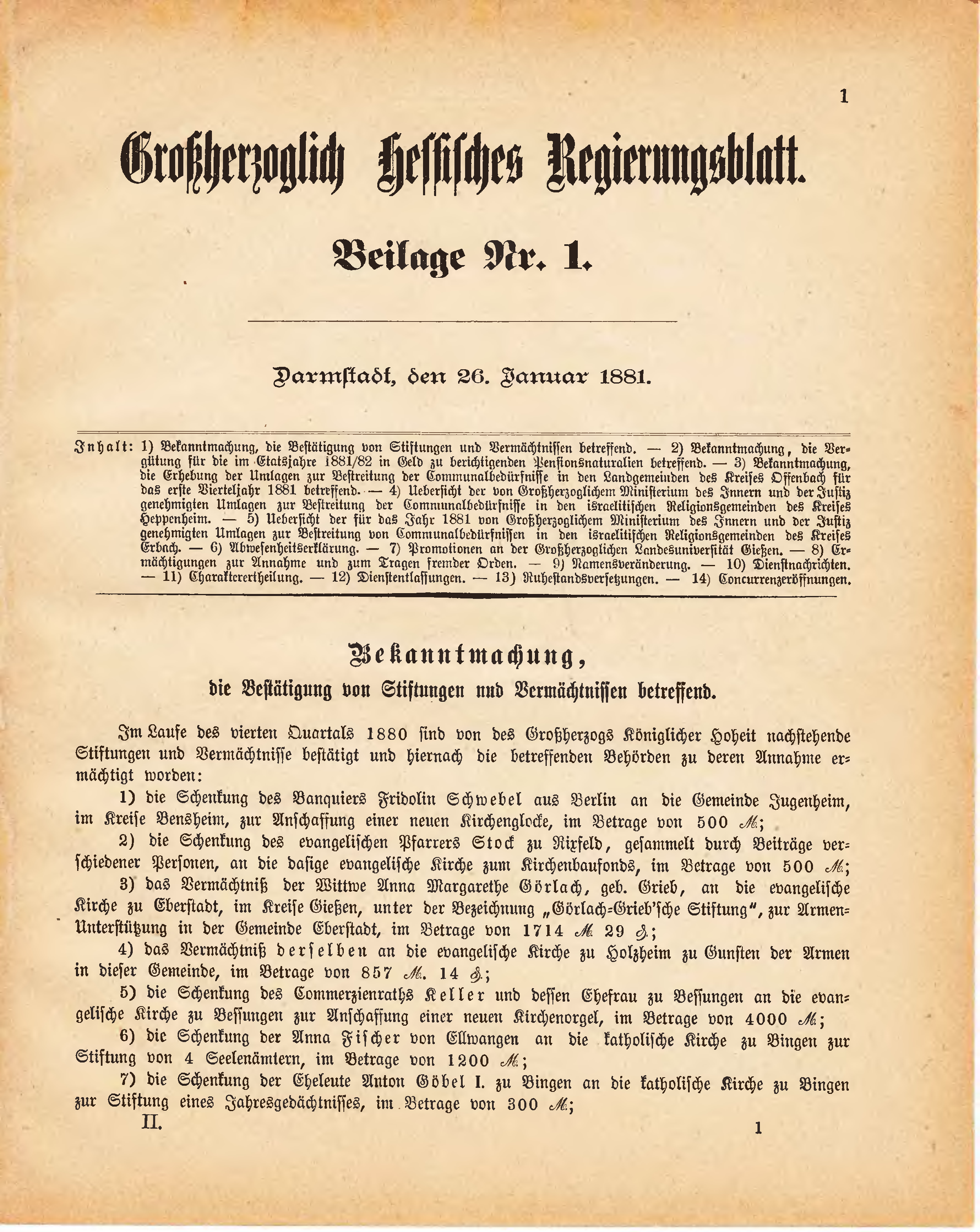 Im Laufe des vierten Quartals 1880 sind von des Großherzogs Königlicher Hoheit nachstehende Stiftungen und Vermächtnisse bestätigt und hiernach die betreffenden Behörden zu deren Annahme ermächtigt worden: