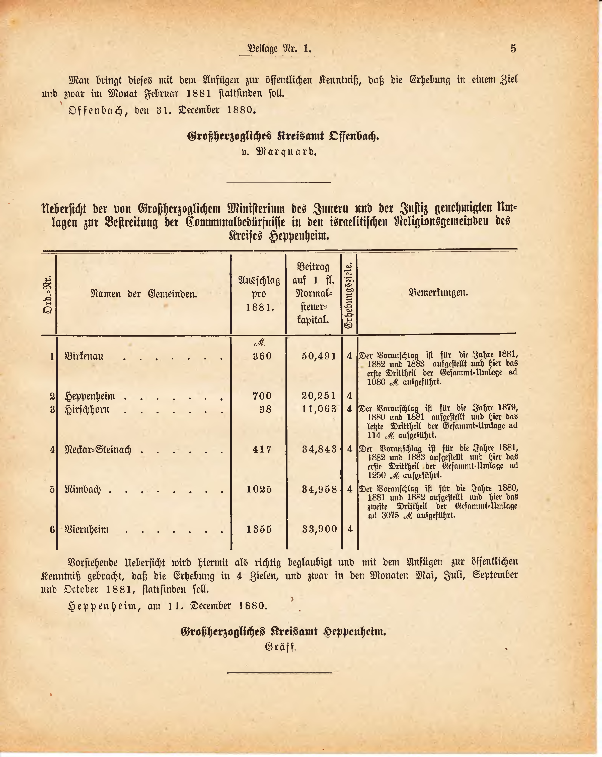 Uebersicht der von Großherzoglichem Ministerium des Innern und der Justiz genehmigten Umlagen zur Bestrettung der Communalbedürfnisse in den israelitischen Religionsgemeinden des Kreises Heppenheim.