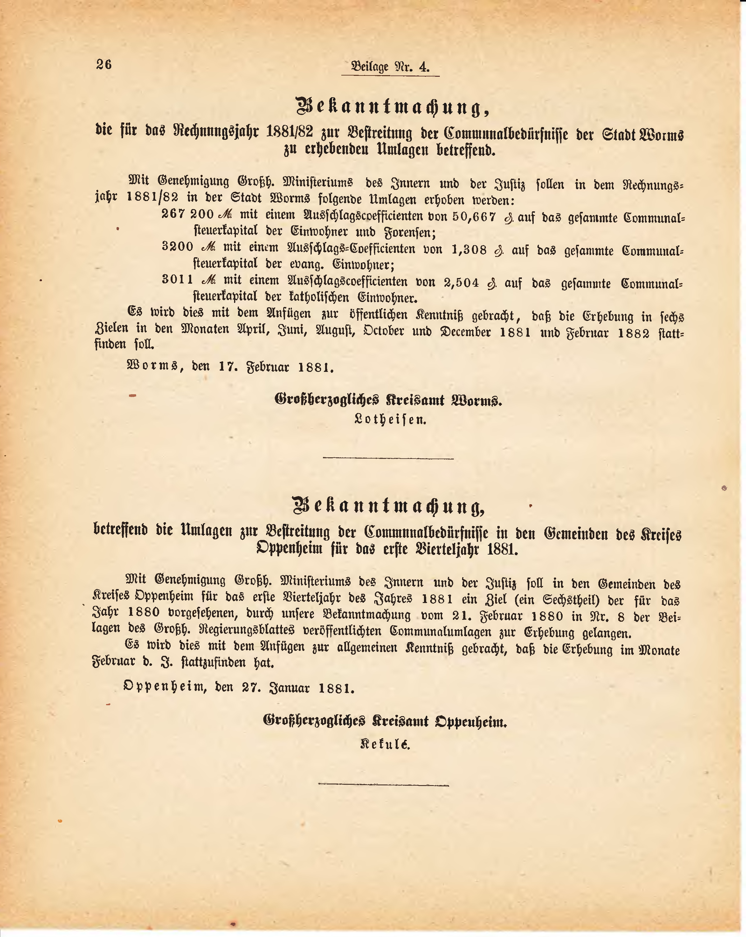 Mit Genehmigung Großh. Ministeriums des Innern und der Justiz soll in den Gemeinden des Kreises Oppenheim für das erste Vierteljahr des Jahres 1881 ein Ziel (ein Sechstheil) der für das Jahr 1880 vorgesehenen, durch unsere Bekanntmachung vom 21. Februar 1880 in Nr. 8 der Beilagen des Großh. Regierungsblattes veröffentlichten Communalumlagen zur Erhebung gelangen.