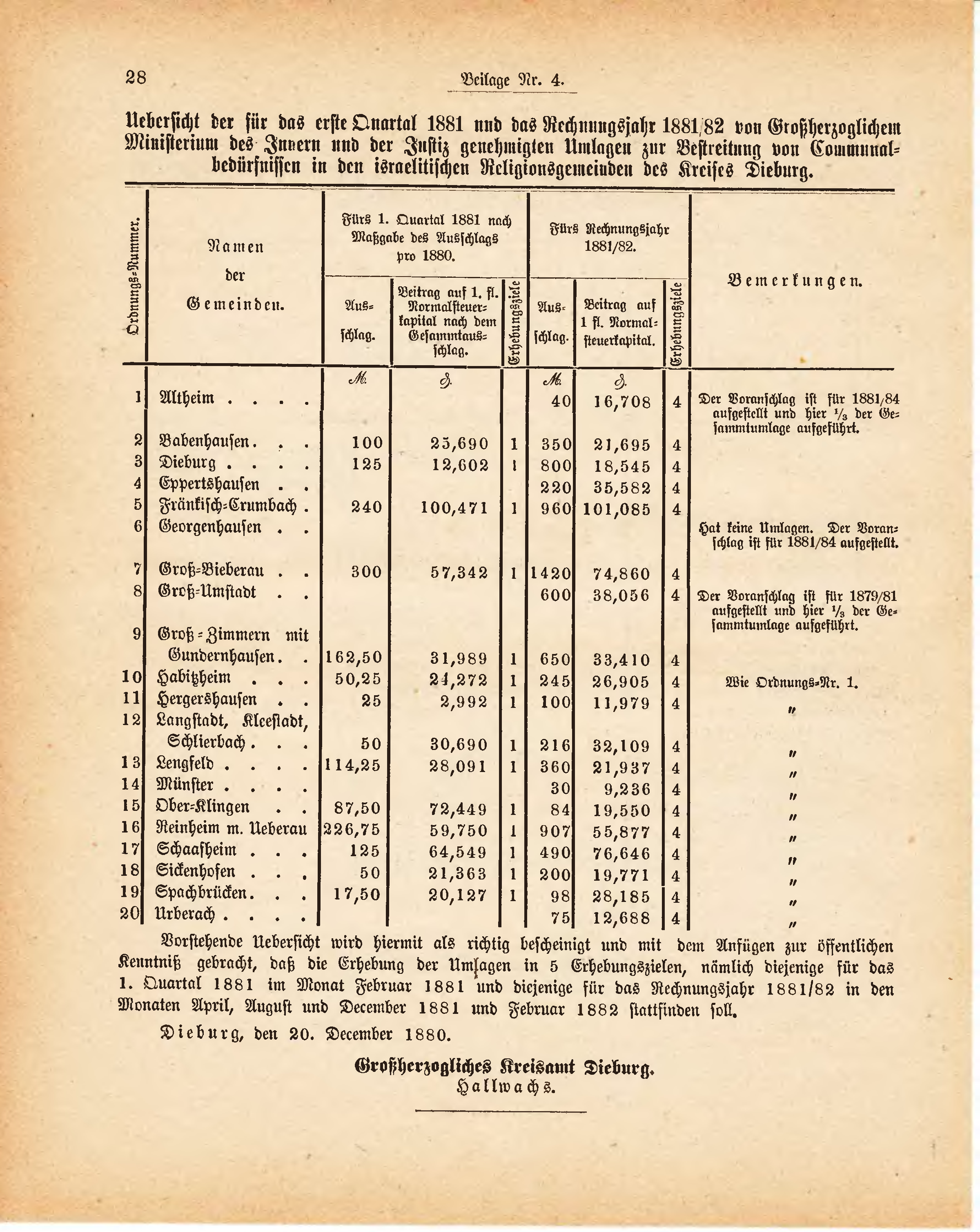 Beilage Nr. 4. Uebersicht der für das erste Quartal 1881 und das Rechnungsjahr 1881/182 von Großherzoglichem Ministerium des Innern und der Justiz genehmigten Umlagen zur Bestreitung von Communalbedürfnissen in den israelitischen Religionsgemeinden des Kreises Dieburg.