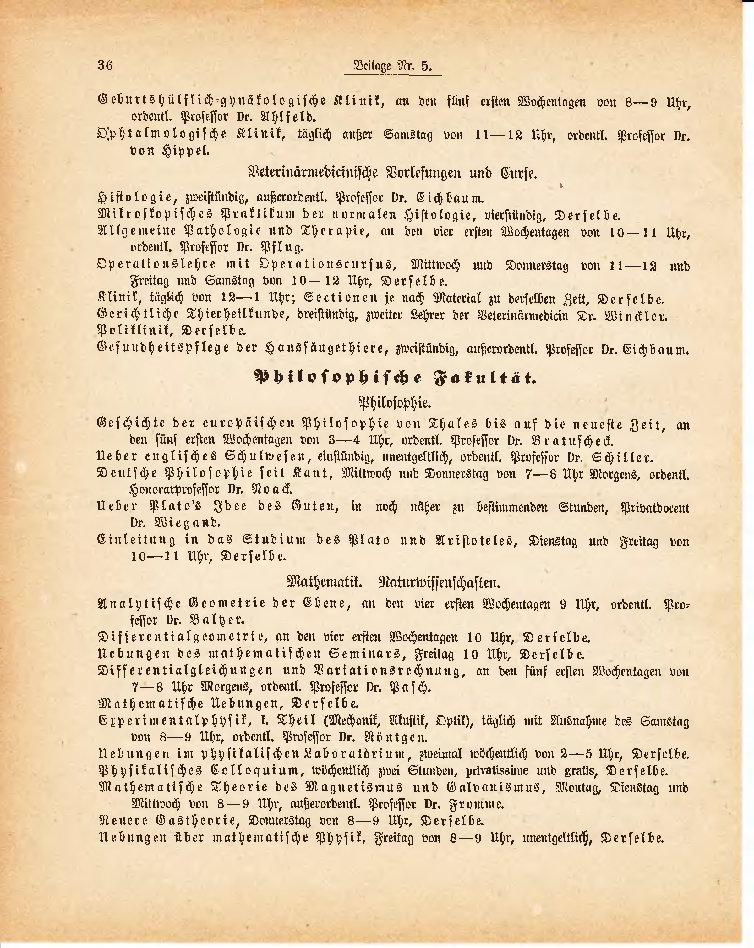 Experimentalphysik, I. Theil (Mechanik, Akustik, Optik), täglich mit Ausnahme des Samstag von 8-9 Uhr, ordentl. Professor Dr. Röntgen.