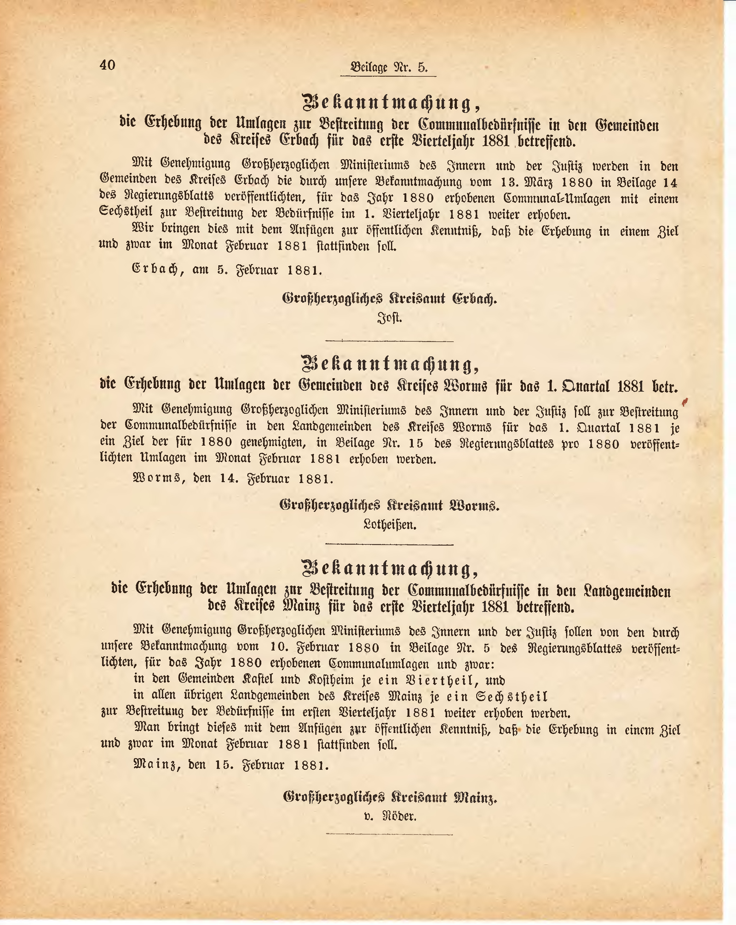 Mit Genehmigung Großherzoglichen Ministeriums des Innern und der Justiz soll zur Bestreitung der Communalbedürfnisse in den Landgemeinden des Kreises Worms für das 1. Quartal 1881 je ein Ziel der für 1880 genehmigten, in Beilage Nr. 15 des Regierungsblattes pro 1880 veröffentlichten Umlagen im Monat Februar 1881 erhoben werden.
