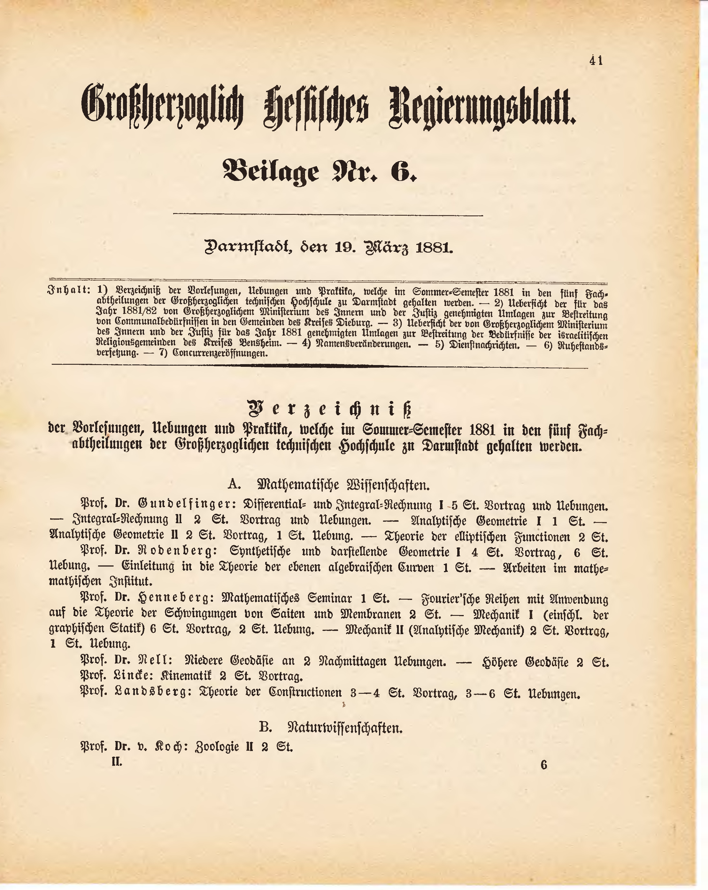 | Inhalt: | 1) Verzeichniß der Vorlesungen, Uebungen und Praktika, welche im Sommer-Semester 1881 in den fünf Fachabtheilungen der Großherzoglichen technischen Hochschule zu Darmstadt gehalten werden. - 2) Uebersicht der für das Jahr 1881/82 von Großherzoglichem Ministerium des Innern und der Justiz genehmigten Umlagen zur Bestreitung von Communalbedürfnissen in den Gemeinden des Kreises Dieburg. - 3) Uebersicht der von Großherzoglichem Ministerium des Innern und der Justiz für das Jahr 1881 genehmigten Umlagen zur Bestreitung der Bedürfnisse der israelitischen Religionsgemeinden des Kreises Bensheim. - 4) Namensveränderungen. - 5) Dienstnachrichten. - 6) Ruhestandsversetzung. - 7) Concurrenzeröffnungen. |