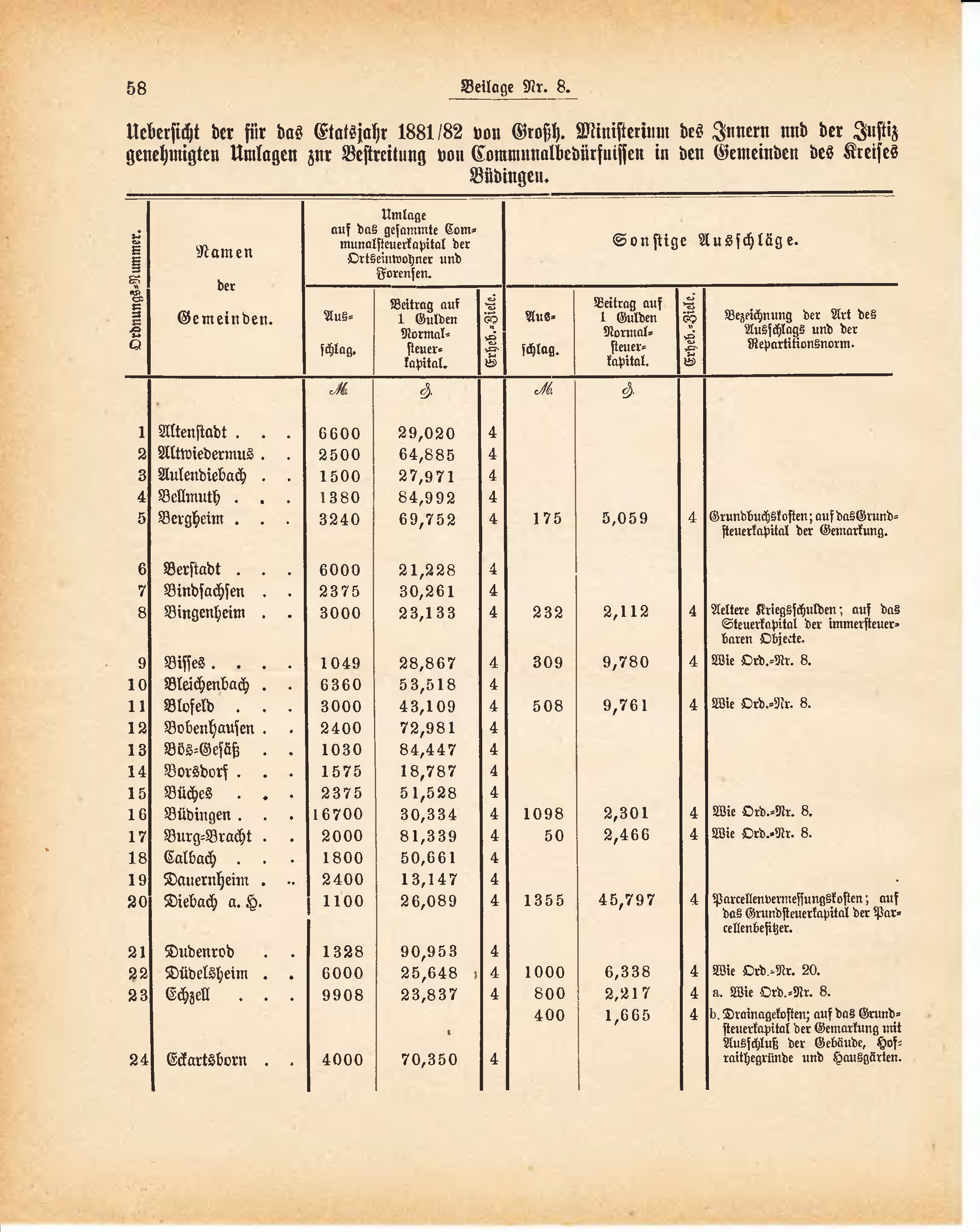 Uebersicht der für das Etatsjahr 1881/82 von Großh. Ministerium des Innern und der Justiz genehmigten Umlagen zur Bestreitung von Communalbedürfnissen in den Gemeinden des Kreises Büdingen.