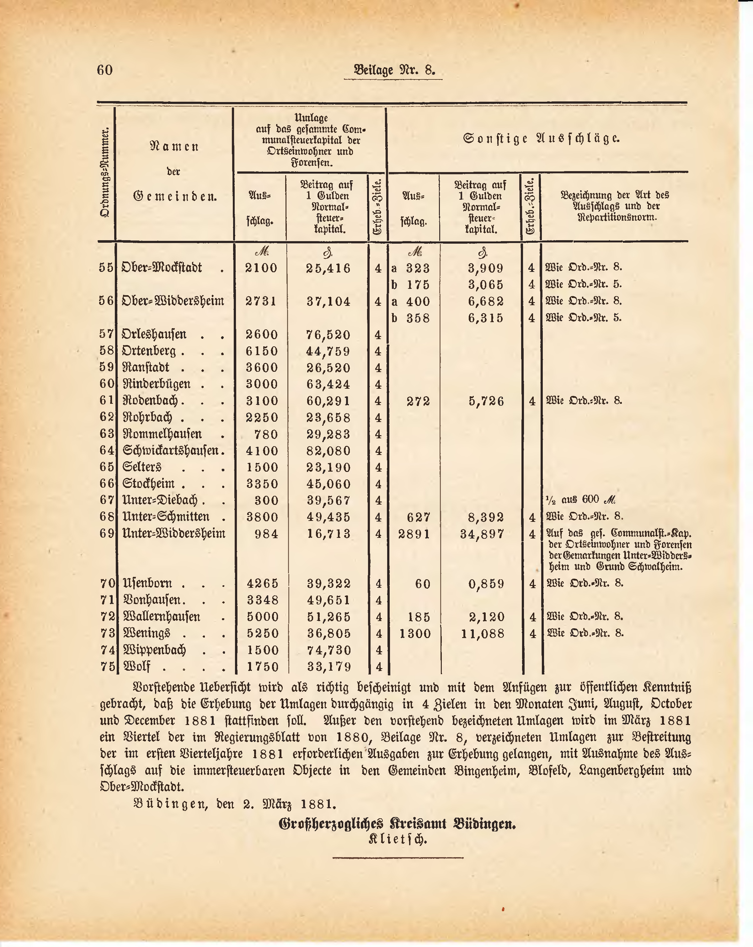 Vorstehende Uebersicht wird als richtig bescheinigt und mit dem Anfügen zur öffentlichen Kenntniß gebracht, daß die Erhebung der Umlagen durchgängig in 4 Zielen in den Monaten Juni, August, October und December 1881 stattfinden soll. Außer den vorstehend bezeichneten Umlagen wird im März 1881 ein Viertel der im Regierungsblatt von 1880, Beilage Nr. 8, verzeichneten Umlagen zur Bestreitung der im ersten Vierteljahre 1881 erforderlichen Ausgaben zur Erhebung gelangen, mit Ausnahme des Ausschlags auf die immersteuerbaren Objecte in den Gemeinden Bingenheim, Blofeld, Langenbergheim und Ober-Mockstadt.