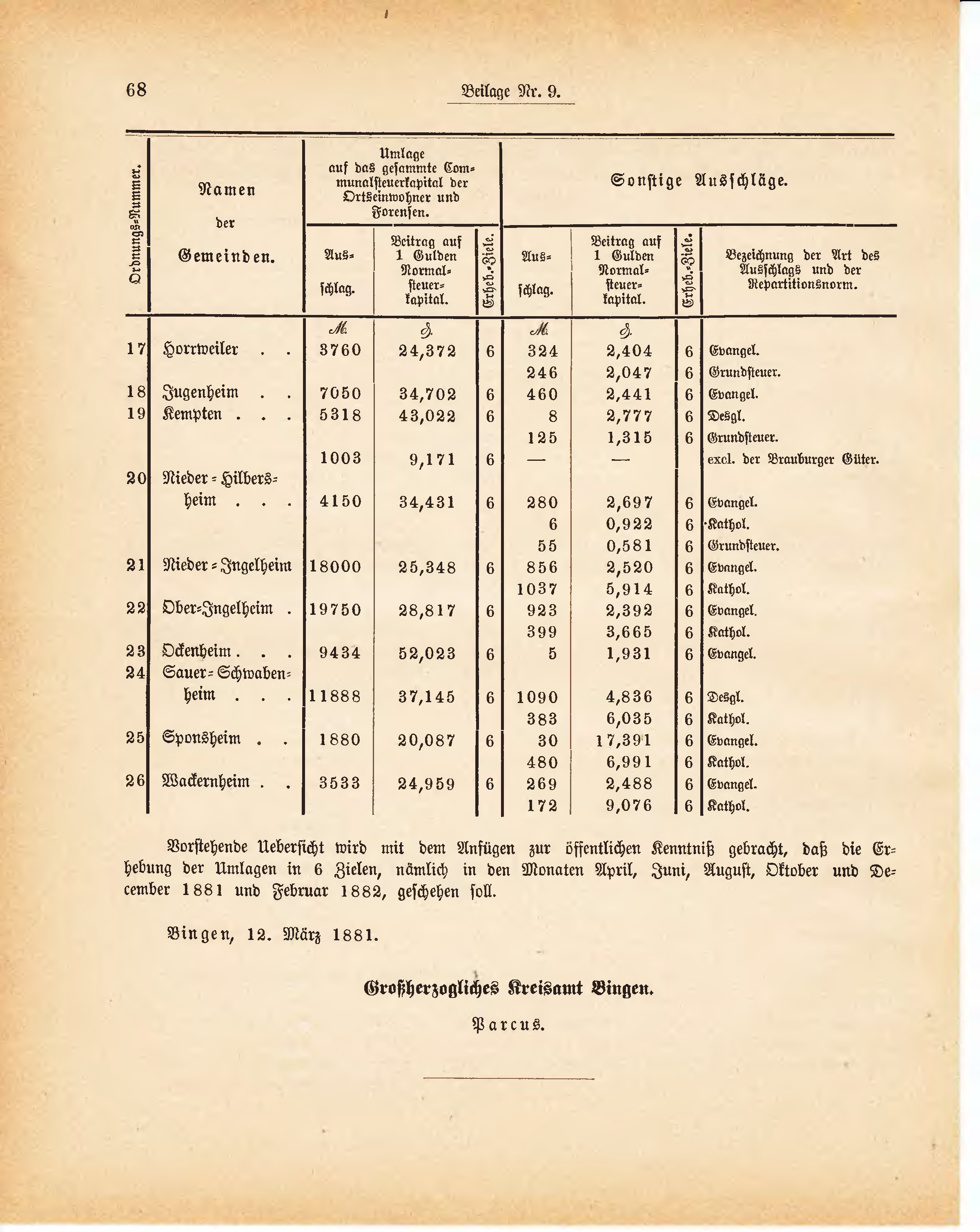 Vorstehende Uebersicht wird mit dem Anfügen zur öffentlichen Kenntniß gebracht, daß die Erhebung der Umlagen in 6 Zielen, nämlich in den Monaten April, Juni, August, Oktober und December 1881 und Februar 1882, geschehen soll.