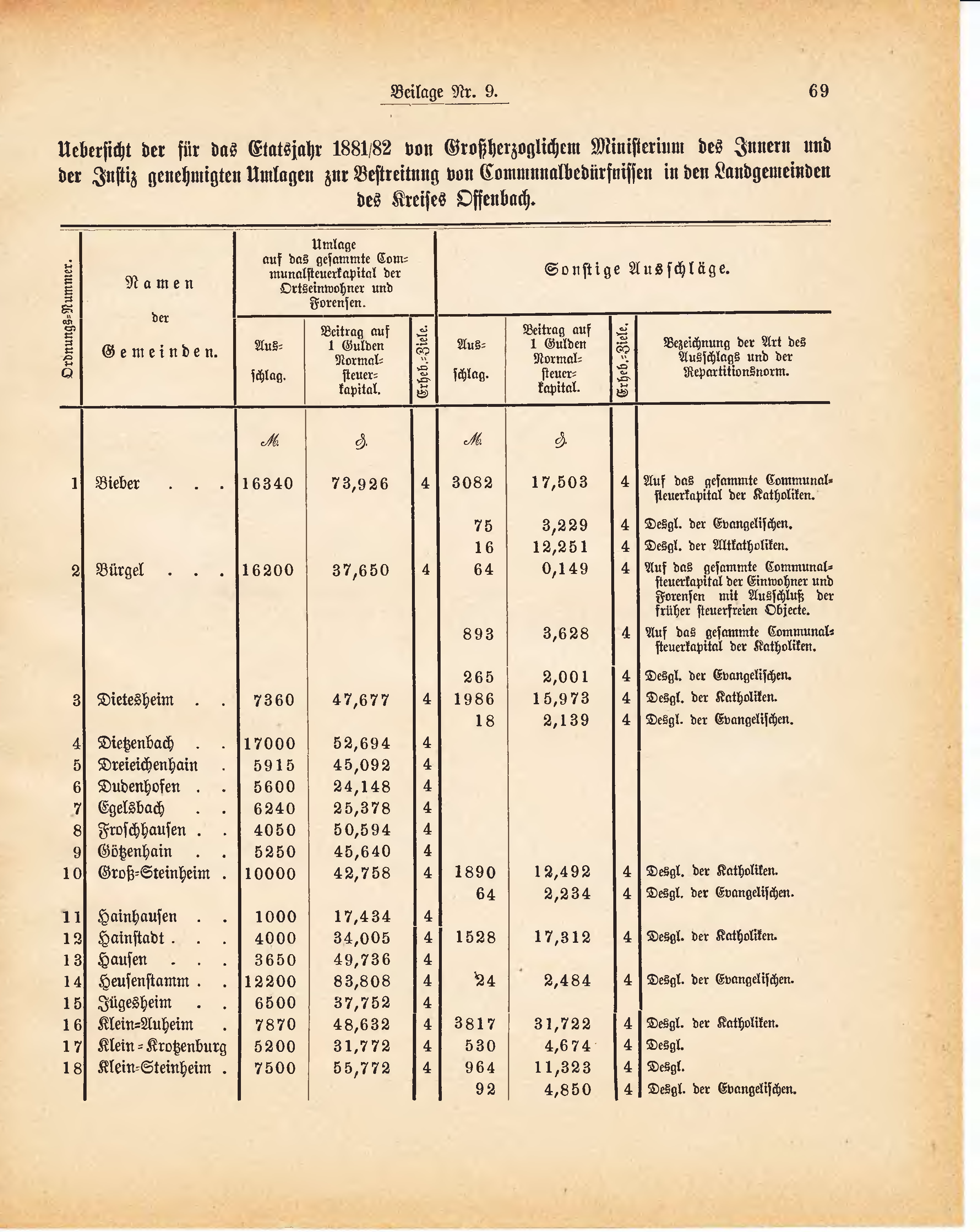 Uebersicht der für das Etatsjahr 1881/82 von Großherzoglichem Ministerium des Innern und der Justiz genehmigten Umlagen zur Bestreitung von Communalbedürfnissen in den Landgemeinden des Kreises Offenbach.