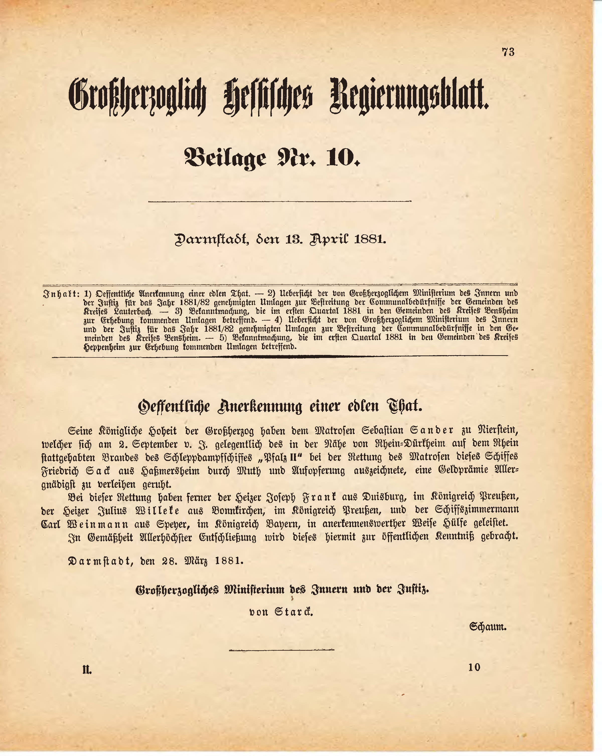 Seine Königliche Hoheit der Großherzog haben dem Matrosen Sebastian Sander zu Nierstein, welcher sich am 2. September v. J. gelegentlich des in der Nähe von Rhein-Dürkheim auf dem Rhein stattgehabten Brandes des Schleppdampfschiffes "Pfalz II" bei der Rettung des Matrosen dieses Schiffes Friedrich Sack} aus Haßmersheim durch Muth und Aufopferung auszeichnete, eine Geldprämie Allergnädigst zu verleihen geruht.