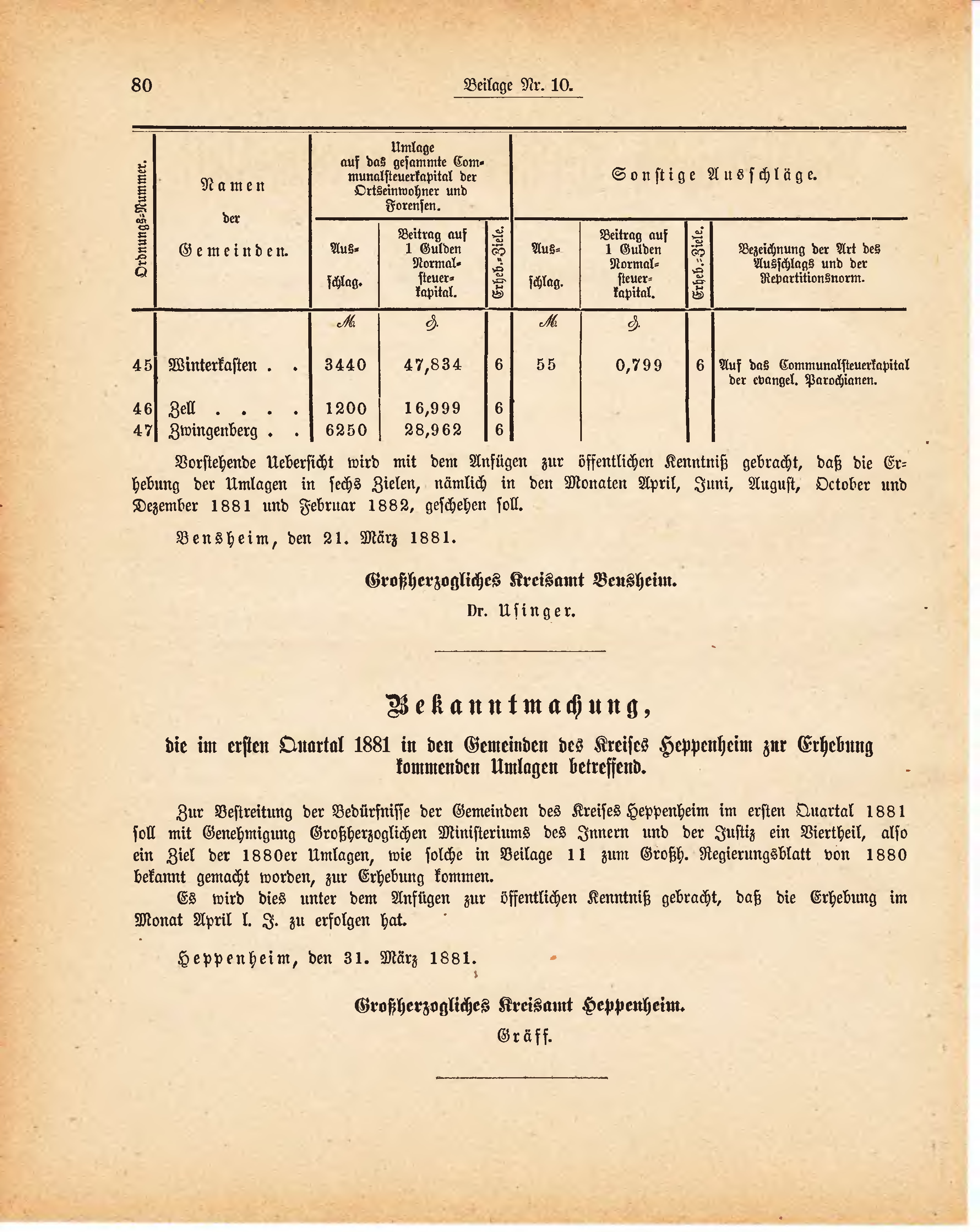 Zur Bestreitung der Bedürfnisse der Gemeinden des Kreises Heppenheim im ersten Quartal 1881 soll mit Genehmigung Großherzoglichen Ministeriums des Innern und der Justiz ein Viertheil, also ein Ziel der 1880er Umlagen, wie solche in Beilage 11 zum Großh. Regierungsblatt von 1880 bekannt gemacht worden, zur Erhebung kommen.