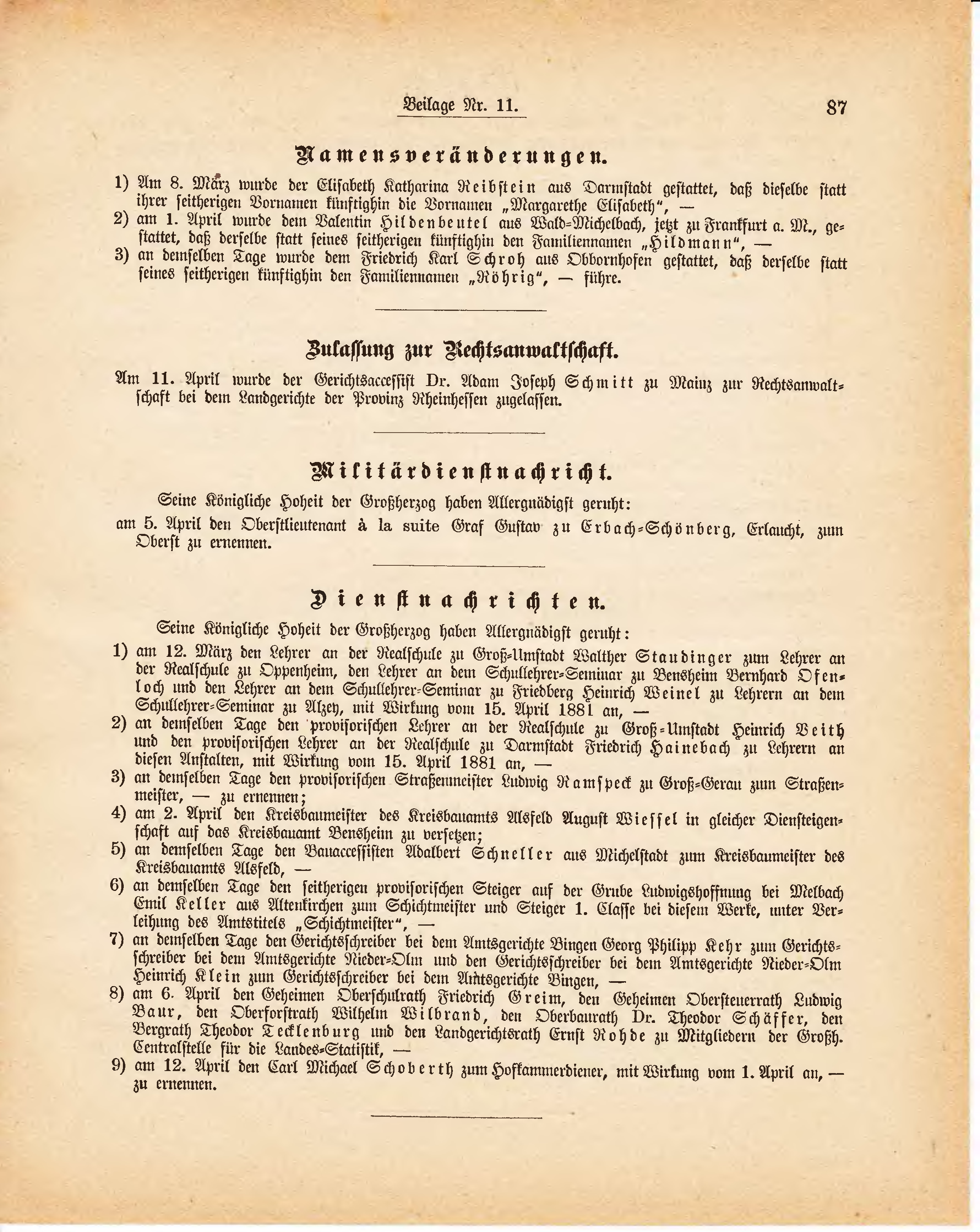 | 2) | am 1. April wurde dem Valentin Hildenbeutel aus Wald-Michelbach, jetzt zu Frankfurt a. M., gestattet, daß derselbe statt seines seitherigen künftighin den Familiennamen "Hildmann", - |