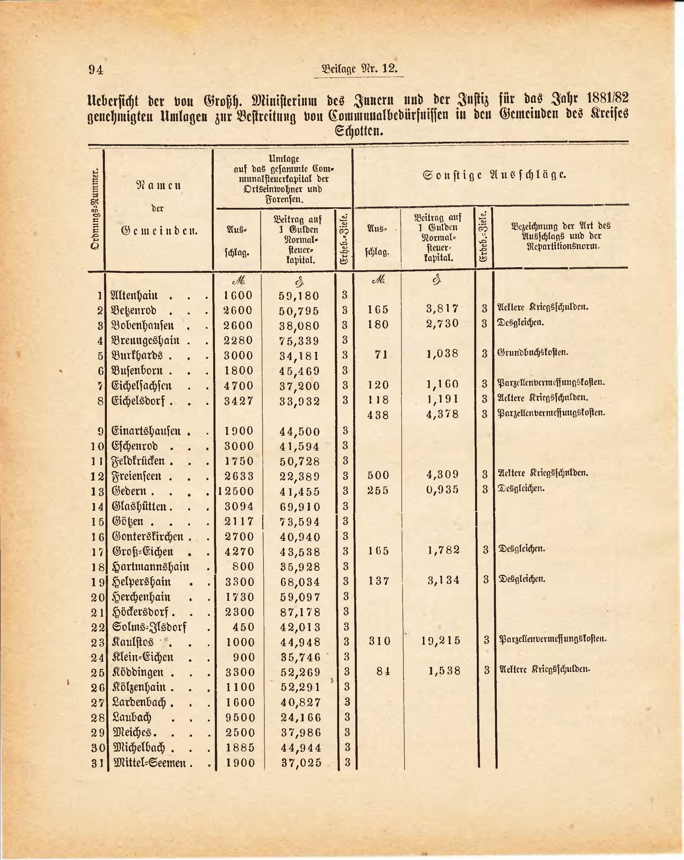 Uebersicht der von Großh. Ministerium des Innern und der Justiz für das Jahr 1881/82 genehmigten Umlagen zur Bestreitung von Communalbedürfnissen in den Gemeinden des Kreises Schotten.