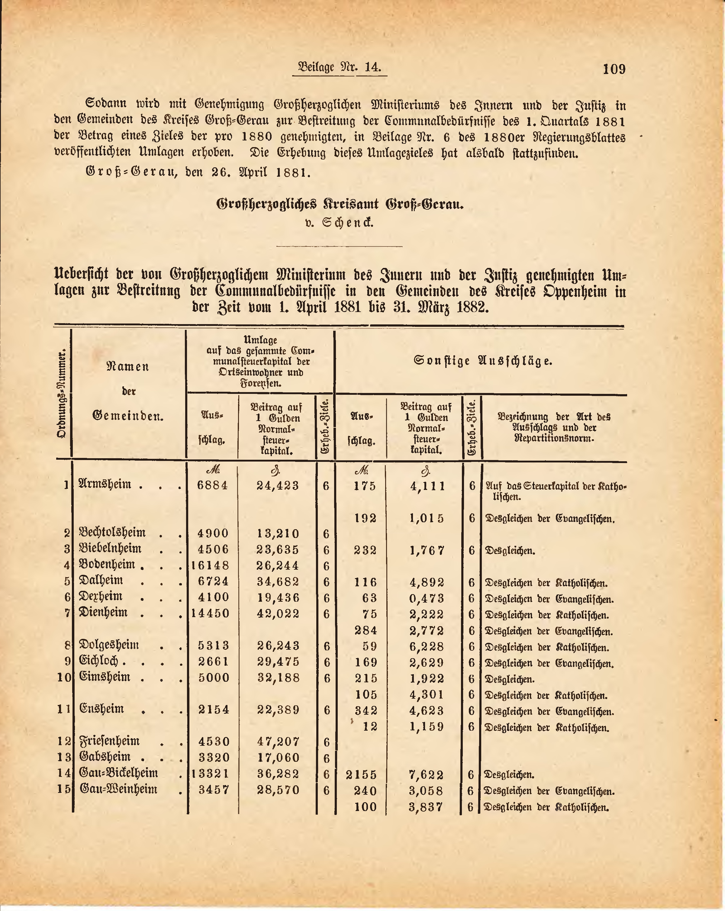 Uebersicht der von Großherzoglichem Ministerium des Innern und der Justiz genehmigten Umlagen zur Bestreitung der Communalbedürfnisse in den Gemeinden des Kreises Oppenheim in der Zeit vom 1. April 1881 bis 31. März 1882.
