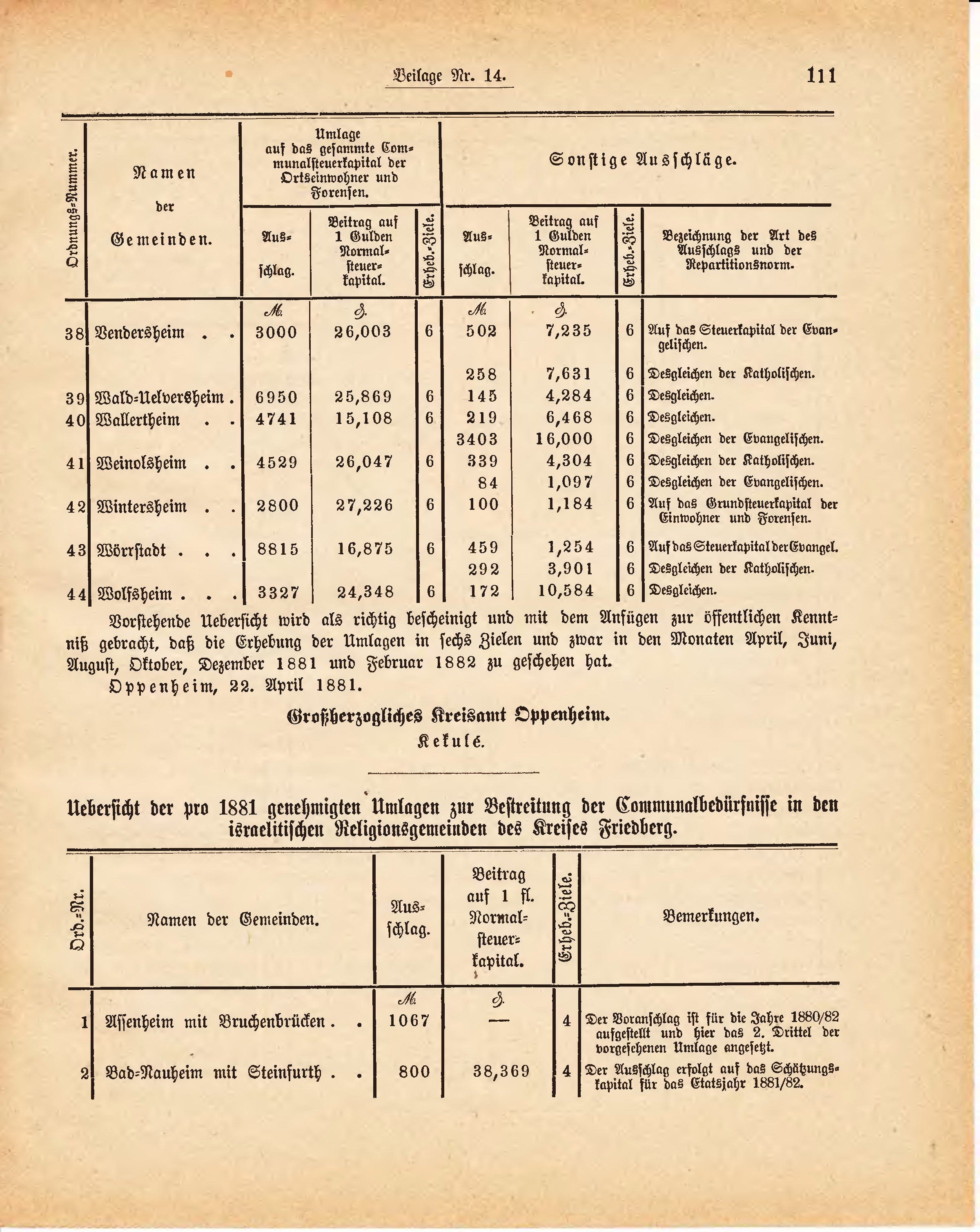 Uebersicht der pro 1881 genehmigten Umlagen zur Bestreitung der Communalbedürfnisse in den israelitischen Religionsgemeinden des Kreises Friedberg.