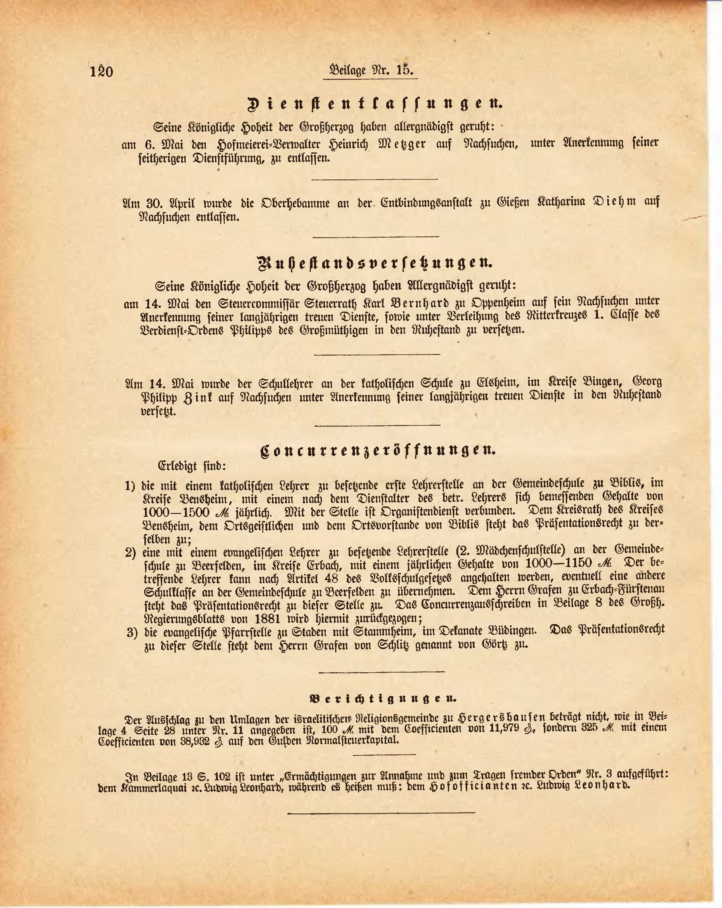 Am 14. Mai wurde der Schullehrer an der katholischen Schule zu Elsheim, im Kreise Bingen, Georg Philipp Zink auf Nachsuchen unter Anerkennung seiner langjährigen treuen Dienste in den Ruhestand versetzt.