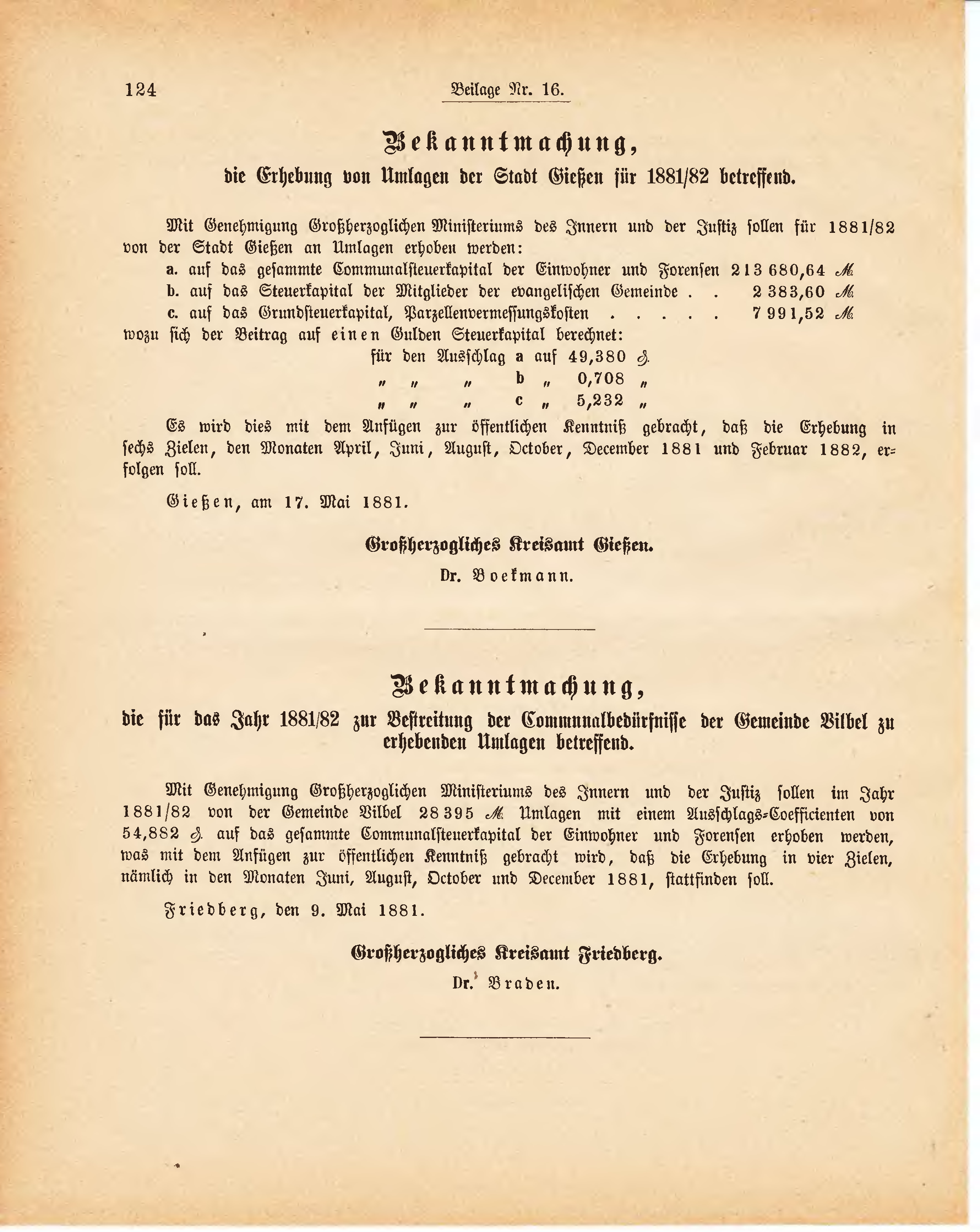 Mit Genehmigung Großherzoglichen Ministeriums des Innern und der Justiz sollen für 1881/82 von der Stadt Gießen an Umlagen erhoben werden: