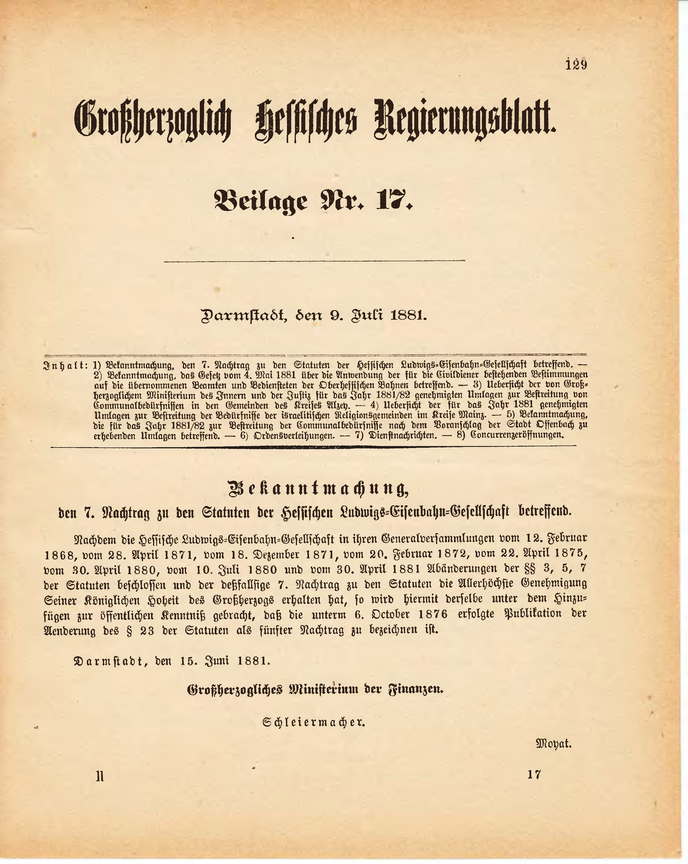 Nachdem die Hessische Ludwigs-Eisenbahn-Gesellschaft in ihren Generalversammlungen vom 12. Februar 1868, vom 28. April 1871, vom 18. Dezember 1871, vom 20. Februar 1872, vom 22. April 1875, vom 30. April 1880, vom 10. Juli 1880 und vom 30. April 1881 Abänderungen der §§ 3, 5, 7 der Statuten beschlossen und der desfallsige 7. Nachtrag zu den Statuten die Allerhöchste Genehmigung Seiner Königlichen Hoheit des Großherzogs erhalten hat, so wird hiermit derselbe unter dem Hinzufügen zur öffentlichen Kenntniß gebracht, daß die unterm 6. October 1876 erfolgte Publikation der Aenderung des § 23 der Statuten als fünfter Nachtrag zu bezeichnen ist.