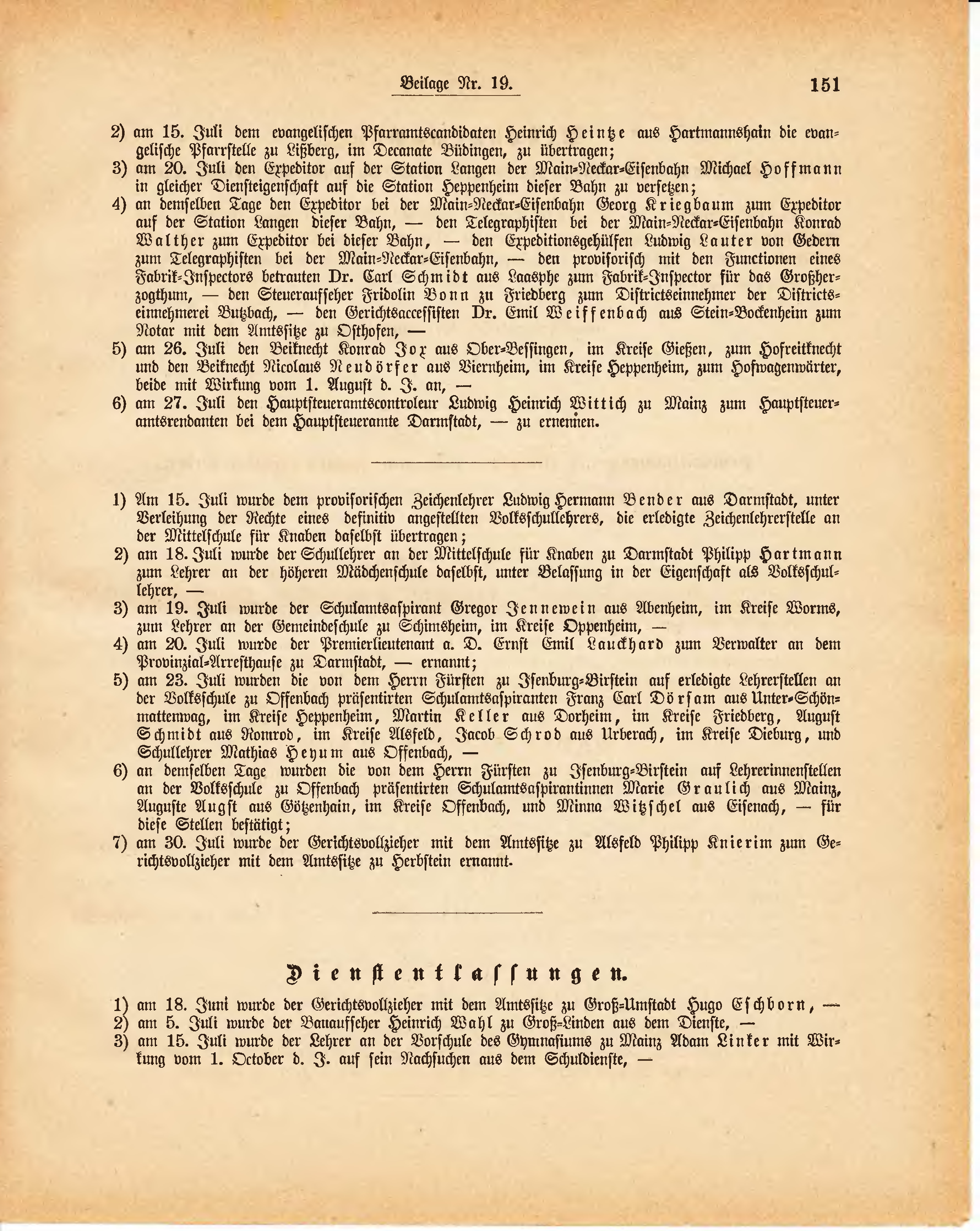 | 6) | am 27. Juli den Hauptsteueramtscontroleur Ludwig Heinrich Wittich zu Mainz zum Hauptsteueramtsrendanten bei dem Hauptsteueramte Darmstadt, - zu ernennen. |