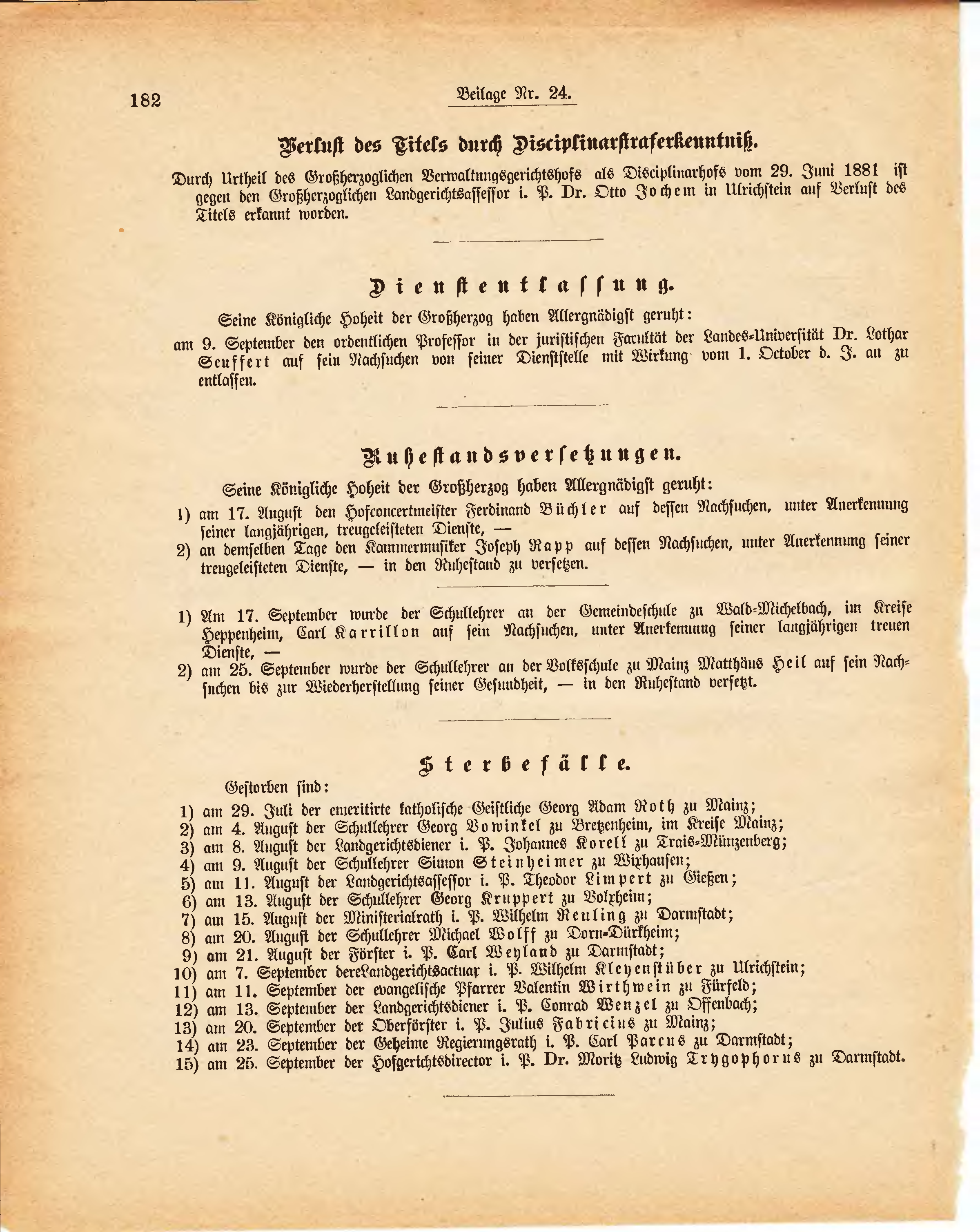 Durch Urtheil des Großherzoglichen Verwaltungsgerichtshofs als Disciplinarhofs vom 29. Juni 1881 ist gegen den Großherzoglichen Landgerichtsassessor i. P. Dr. Otto Jochem in Ulrichstein auf Verlust des Titels erkannt worden.