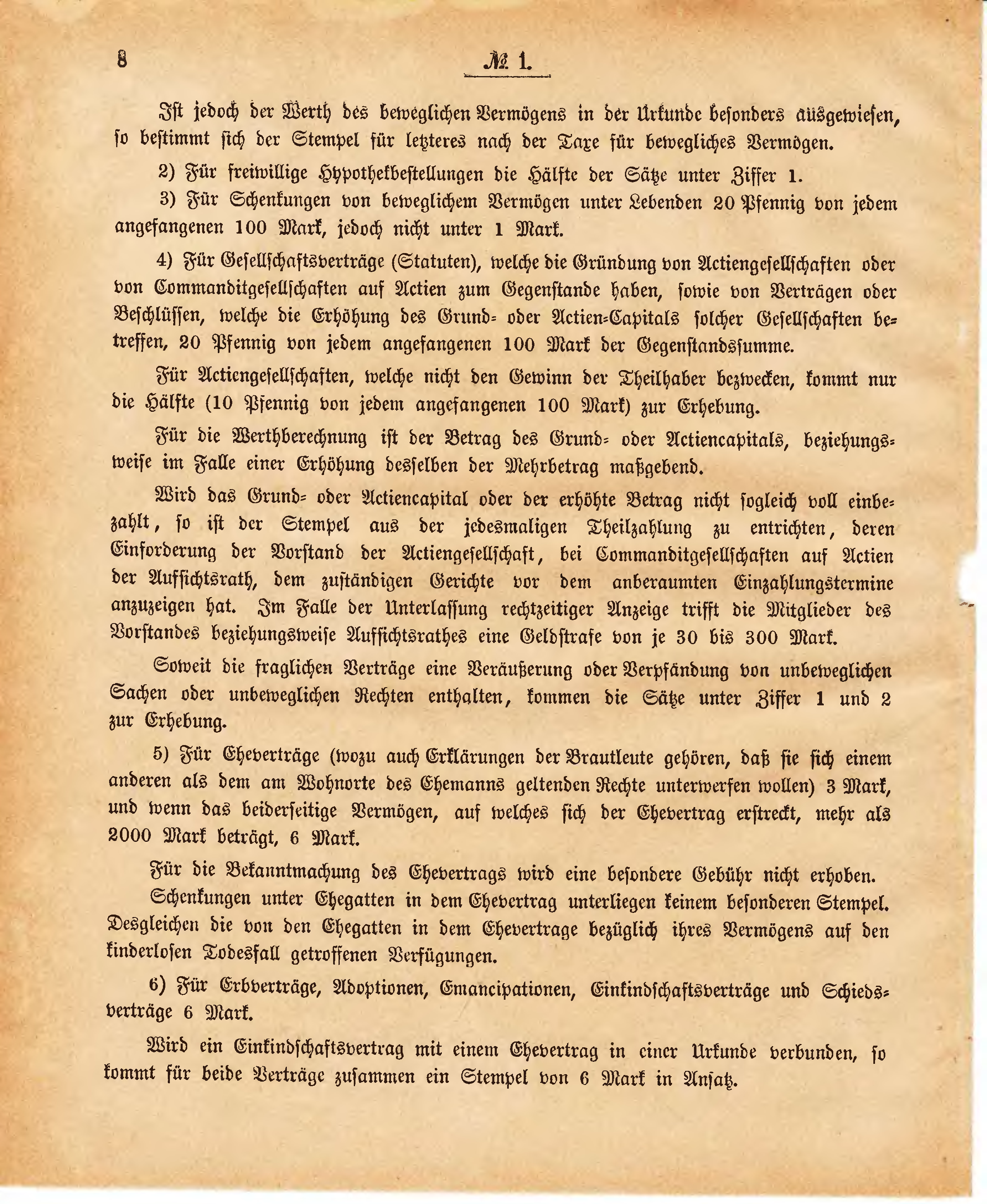 5) Für Eheverträge (wozu auch Erklärungen der Brautleute gehören, daß sie sich einem anderen als dem am Wohnorte des Ehemanns geltenden Rechte unterwerfen wollen) 3 Mark, und wenn das beiderseitige Vermögen, auf welches sich der Ehevertrag erstreckt, mehr als 2000 Mark beträgt, 6 Mark.