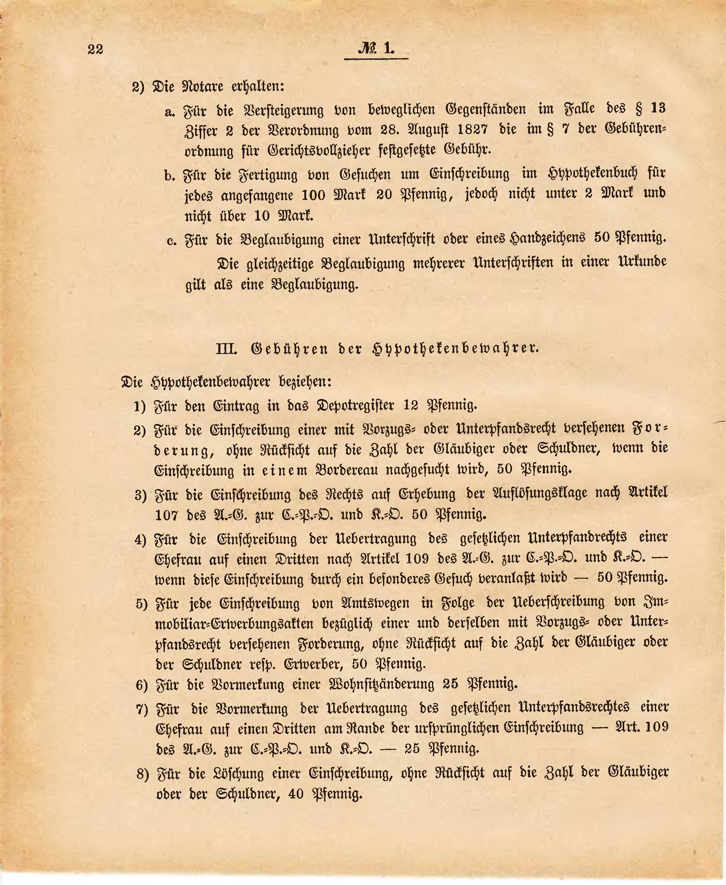 | 7) | Für die Vormerkung der Uebertragung des gesetzlichen Unterpfandsrechtes einer Ehefrau auf einen Dritten am Rande der ursprünglichen Einschreibung - Art. 109 des A.-G. zur C.-P.-O. und K.-O. - 25 Pfennig. | |
