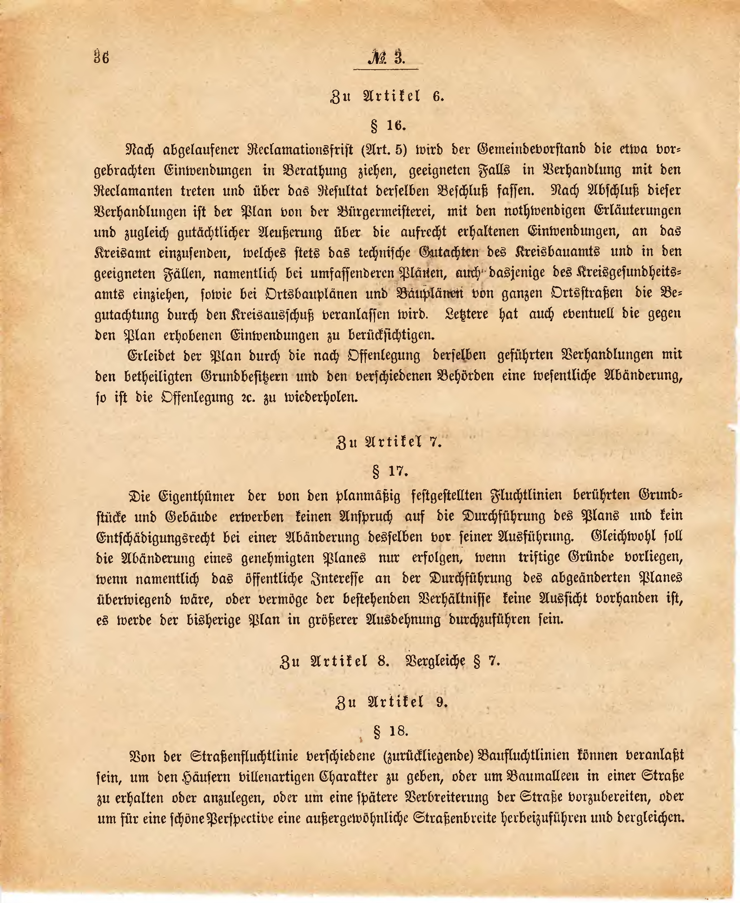 Nach abgelaufener Reclamationsfrist (Art. 5) wird der Gemeindevorstand die etwa vorgebrachten Einwendungen in Berathung ziehen, geeigneten Falls in Verhandlung mit den Reclamanten treten und über das Resultat derselben Beschluß fassen. Nach Abschluß dieser Verhandlungen ist der Plan von der Bürgermeisterei, mit den nothwendigen Erläuterungen und zugleich gutächtlicher Aeußerung über die aufrecht erhaltenen Einwendungen, an das Kreisamt einzusenden, welches stets das technische Gutachten des Kreisbauamts und in den geeigneten Fällen, namentlich bei umfassenderen Plänen, auch dasjenige des Kreisgesundheitsamts einziehen, sowie bei Ortsbauplänen und Bauplänen von ganzen Ortsstraßen die Begutachtung durch den Kreisausschuß veranlassen wird. Letztere hat auch eventuell die gegen den Plan erhobenen Einwendungen zu berücksichtigen.