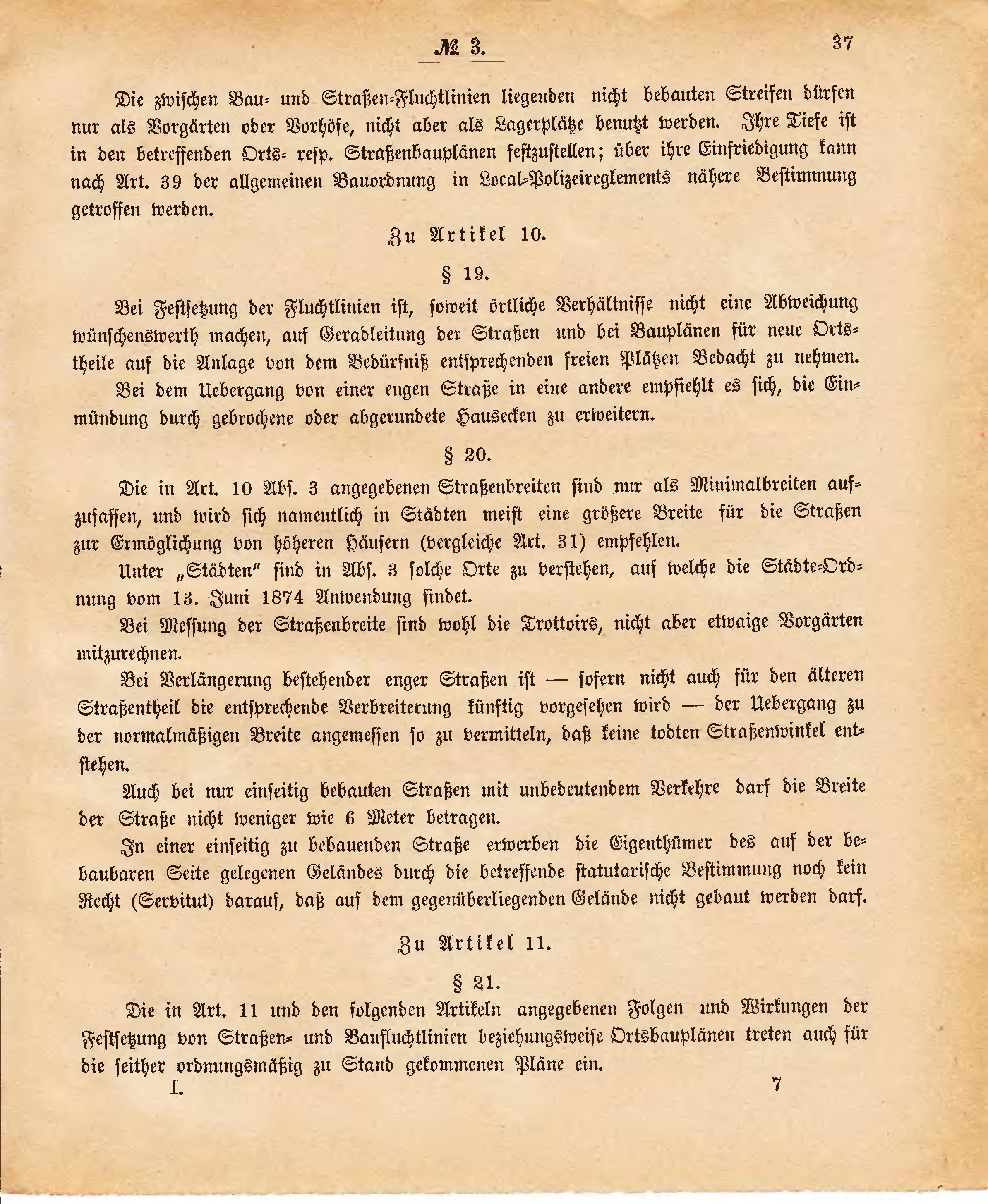 Die in Art. 10 Abs. 3 angegebenen Straßenbreiten sind nur als Minimalbreiten aufzufassen, und wird sich namentlich in Städten meist eine größere Breite für die Straßen zur Ermöglichung von höheren Häusern (vergleiche Art. 31) empfehlen.