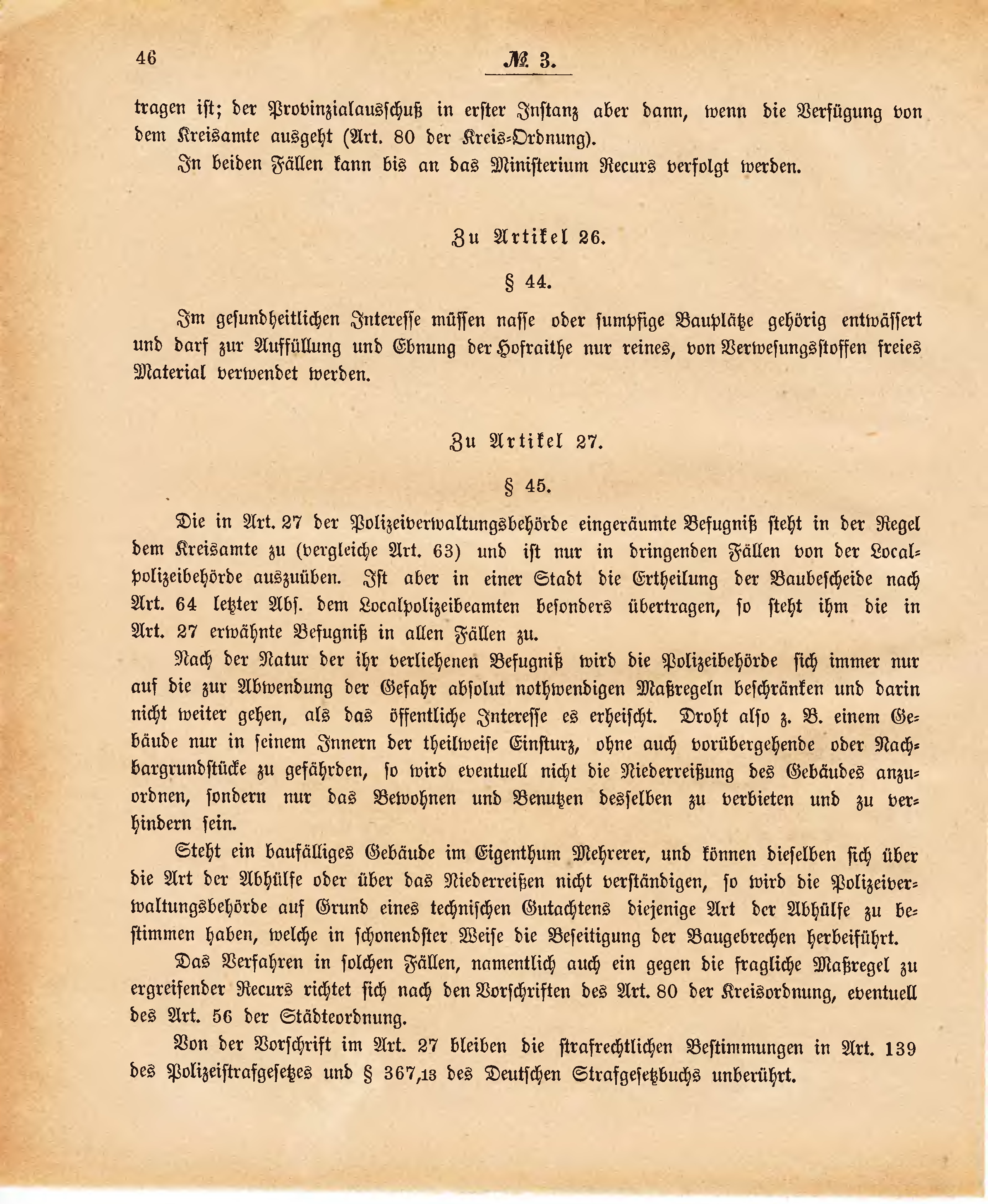 Im gesundheitlichen Interesse müssen nasse oder sumpfige Bauplätze gehörig entwässert und darf zur Auffüllung und Ebnung der Hofraithe nur reines, von Verwesungsstoffen freies Material verwendet werden.