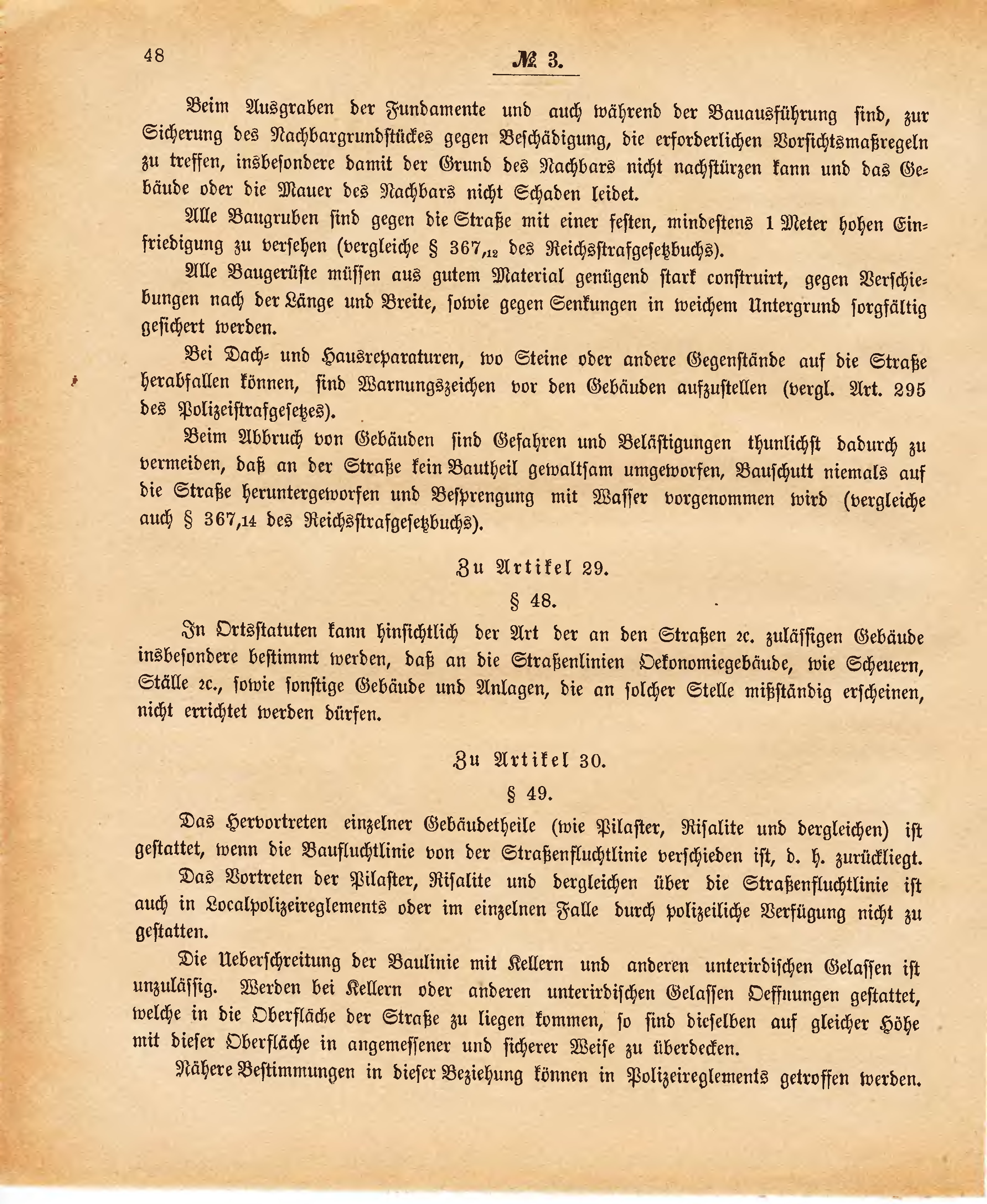 Bei Dach- und Hausreparaturen, wo Steine oder andere Gegenstände auf die Straße herabfallen können, sind Warnungszeichen vor den Gebäuden aufzustellen (vergl. Art. 295 des Polizeistrafgesetzes).