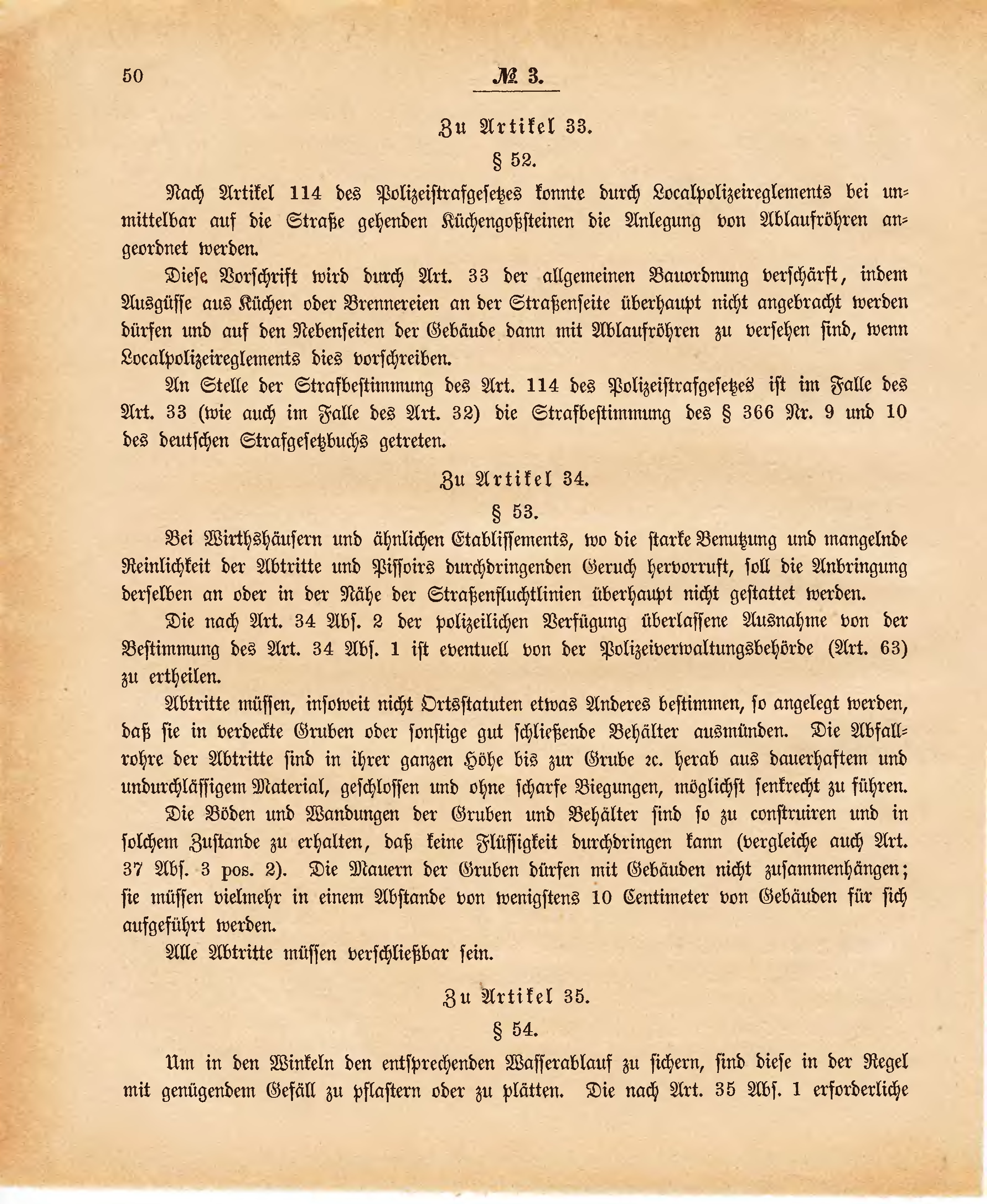 Diese Vorschrift wird durch Art. 33 der allgemeinen Bauordnung verschärft, indem Ausgüsse aus Küchen oder Brennereien an der Straßenseite überhaupt nicht angebracht werden dürfen und auf den Nebenseiten der Gebäude dann mit Ablaufröhren zu versehen sind, wenn Localpolizeireglements dies vorschreiben.