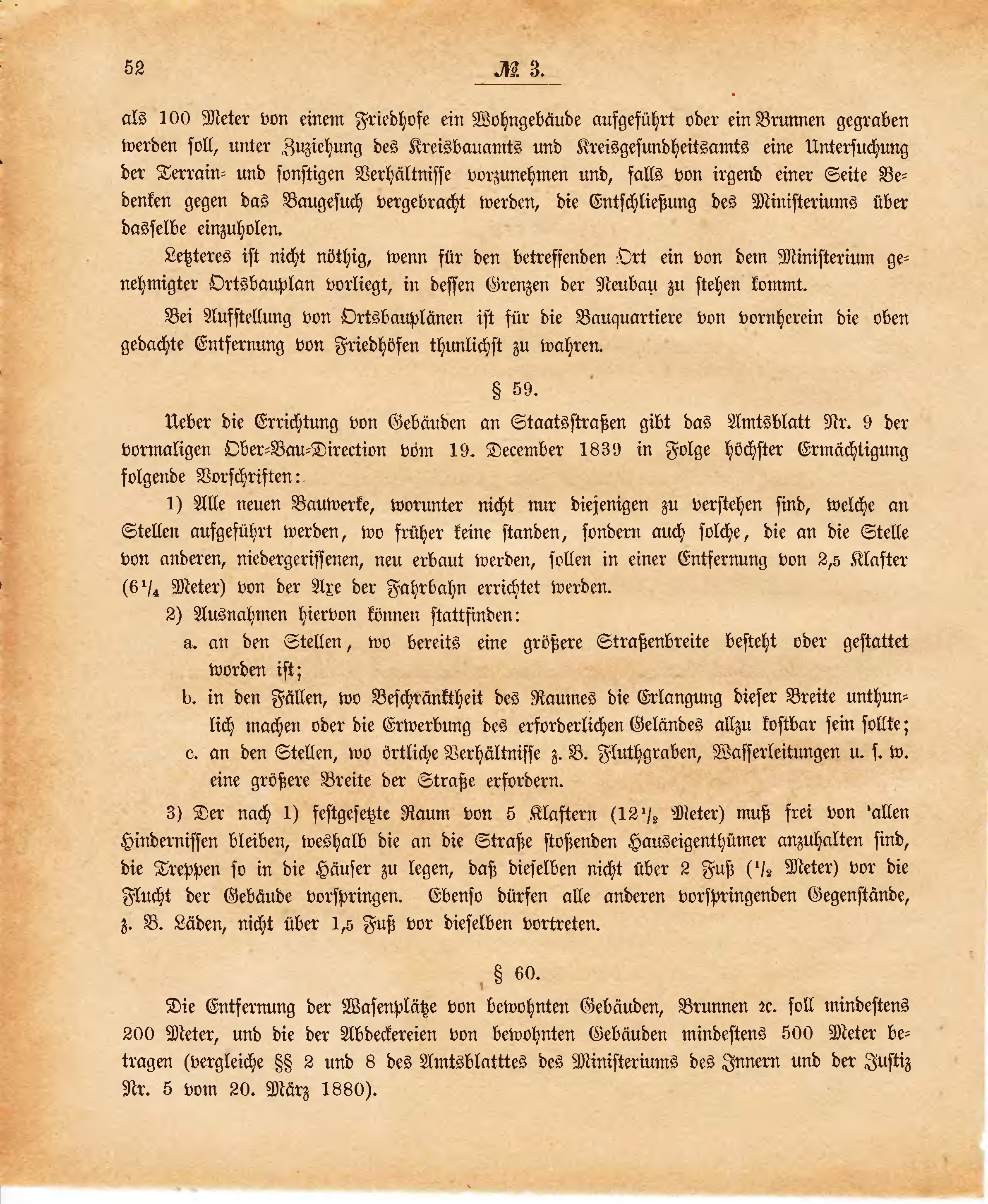 3) Der nach 1) festgesetzte Raum von 5 Klaftern (121/2 Meter) muß frei von allen Hindernissen bleiben, weshalb die an die Straße stoßenden Hauseigenthümer anzuhalten sind, die Treppen so in die Häuser zu legen, daß dieselben nicht über 2 Fuß (1/2 Meter) vor die Flucht der Gebäude vorspringen. Ebenso dürfen alle anderen vorspringenden Gegenstände, z. B. Läden, nicht über 1,5 Fuß vor dieselben vortreten.