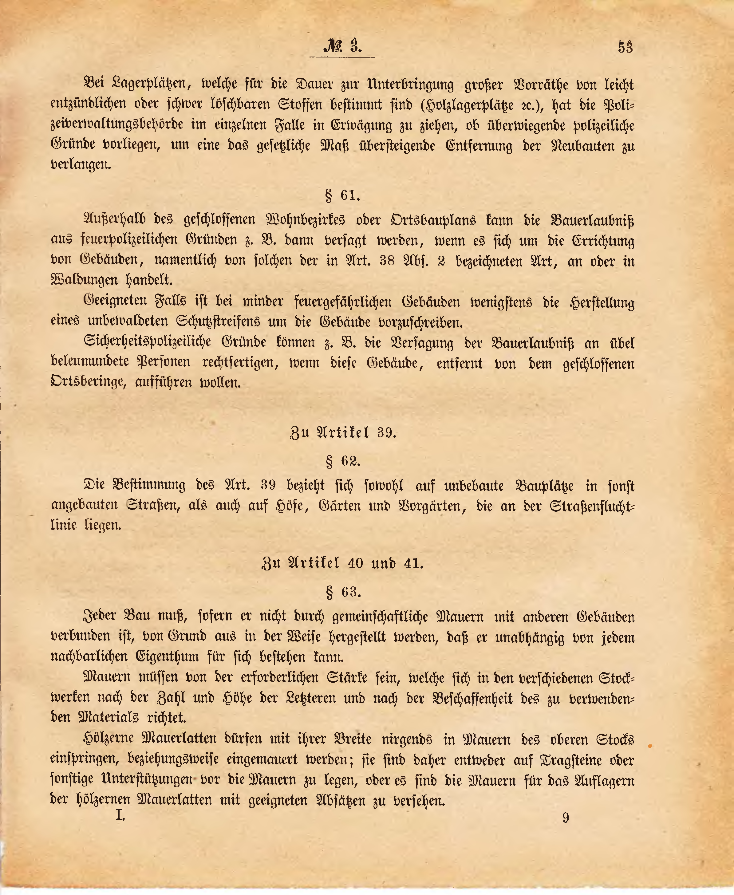 Die Bestimmung des Art. 39 bezieht sich sowohl auf unbebaute Bauplätze in sonst eingebauten Straßen, als auch auf Höfe, Gärten und Vorgärten, die an der Straßenfluchtlinie liegen.