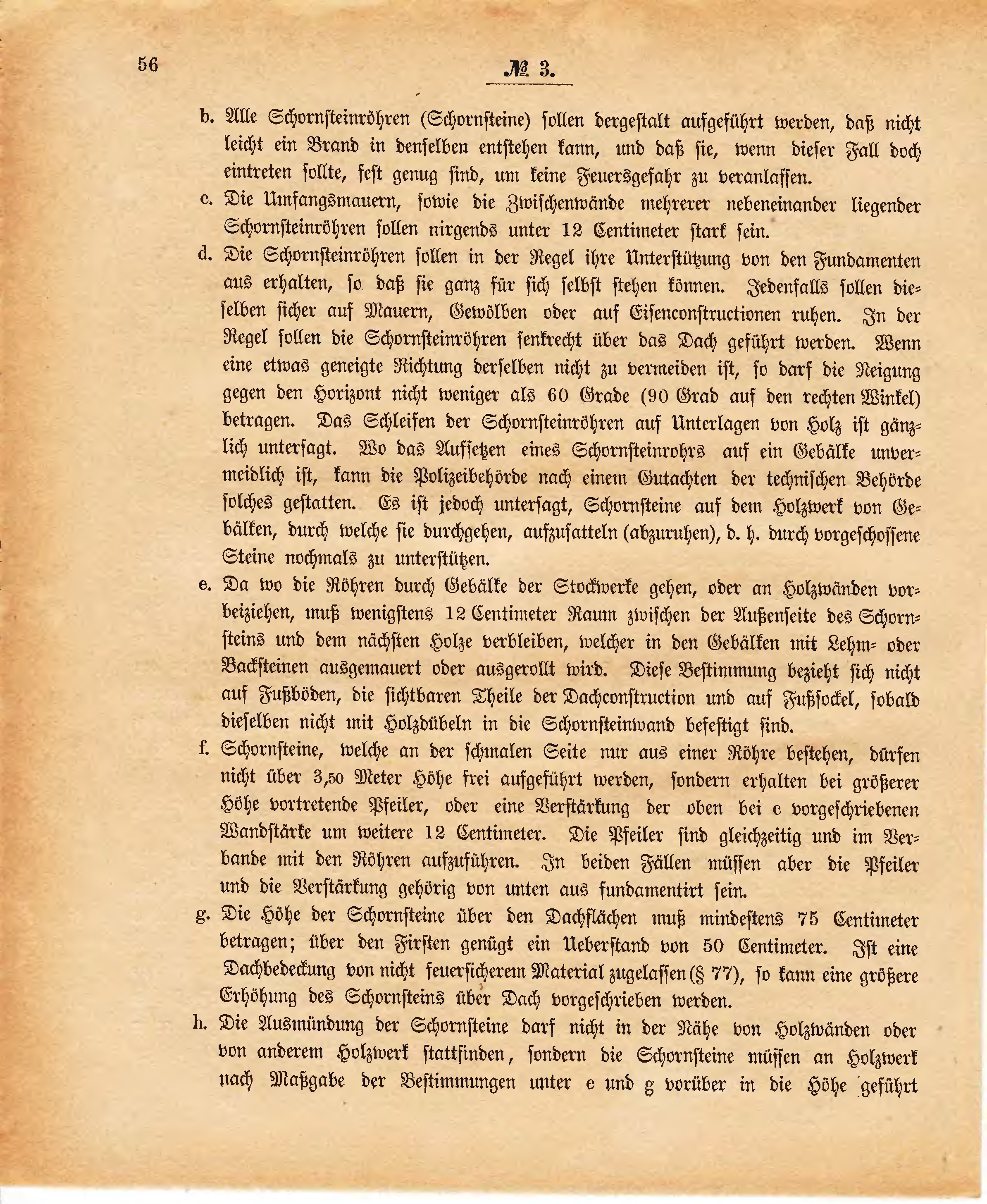 | d. | Die Schornsteinröhren sollen in der Regel ihre Unterstützung von den Fundamenten aus erhalten, so daß sie ganz für sich selbst stehen können. Jedenfalls sollen dieselben sicher auf Mauern, Gewölben oder aus Eisenconstructionen ruhen. In der Regel sollen die Schornsteinröhren senkrecht über das Dach geführt werden. Wenn eine etwas geneigte Richtung derselben nicht zu vermeiden ist, so darf die Neigung gegen den Horizont nicht weniger als 60 Grade (90 Grad auf den rechten Winkel) betragen. Das Schleifen der Schornsteinröhren auf Unterlagen von Holz ist gänzlich untersagt. Wo das Aufsetzen eines Schornsteinrohrs auf ein Gebälke unvermeidlich ist, kann die Polizeibehörde nach einem Gutachten der technischen Behörde solches gestatten. Es ist jedoch untersagt, Schornsteine auf dem Holzwerk von Gebälken, durch welche sie durchgehen, aufzusatteln (abzuruhen), d. h. durch vorgeschossene Steine nochmals zu unterstützen. | ||