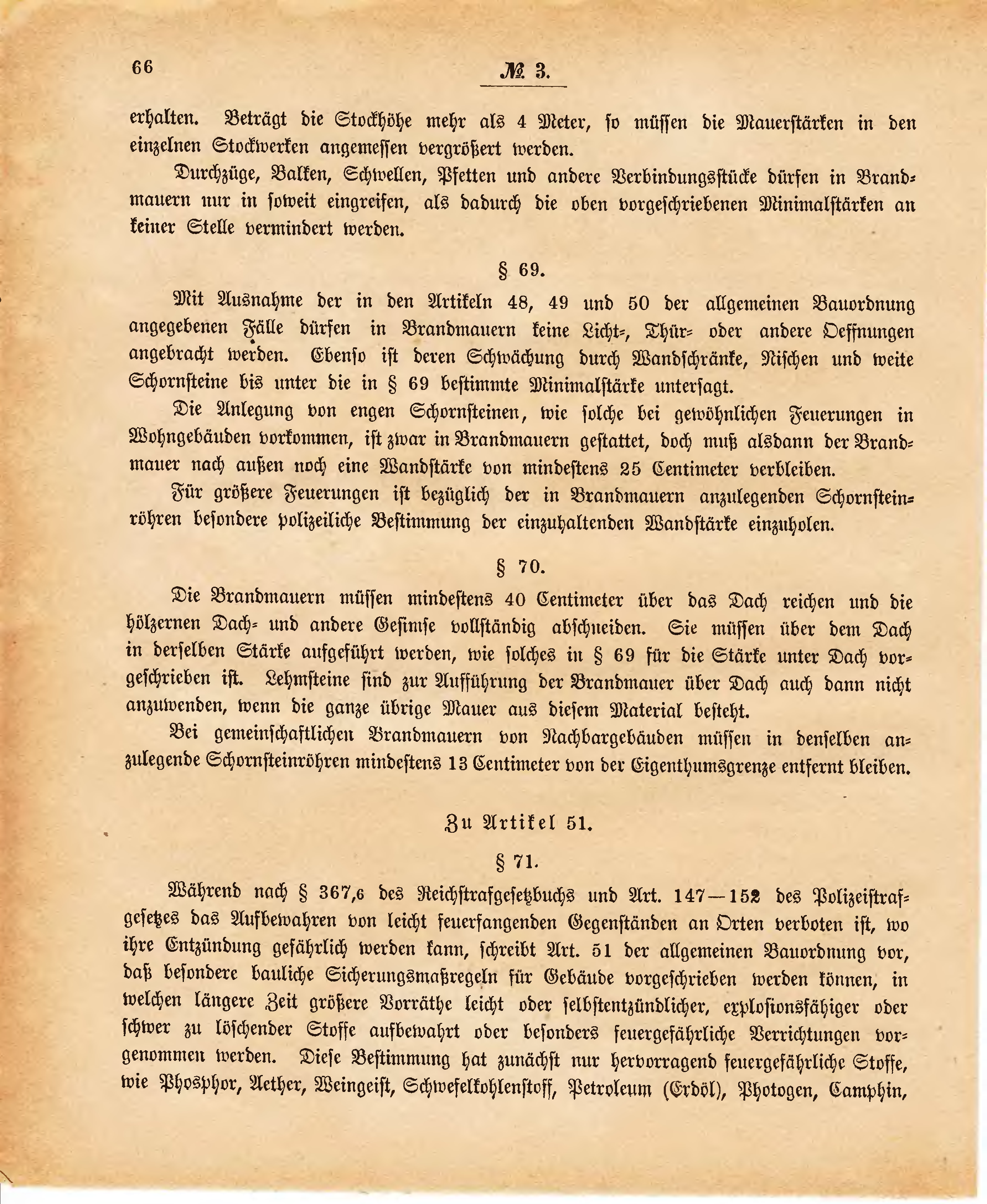 Mit Ausnahme der in den Artikeln 48, 49 und 50 der allgemeinen Bauordnung angegebenen Fälle dürfen in Brandmauern keine Licht-, Thür- oder andere Oeffnungen angebracht werden. Ebenso ist deren Schwächung durch Wandschränke, Nischen und weite Schornsteine bis unter die in § 69 bestimmte Minimalstärke untersagt.