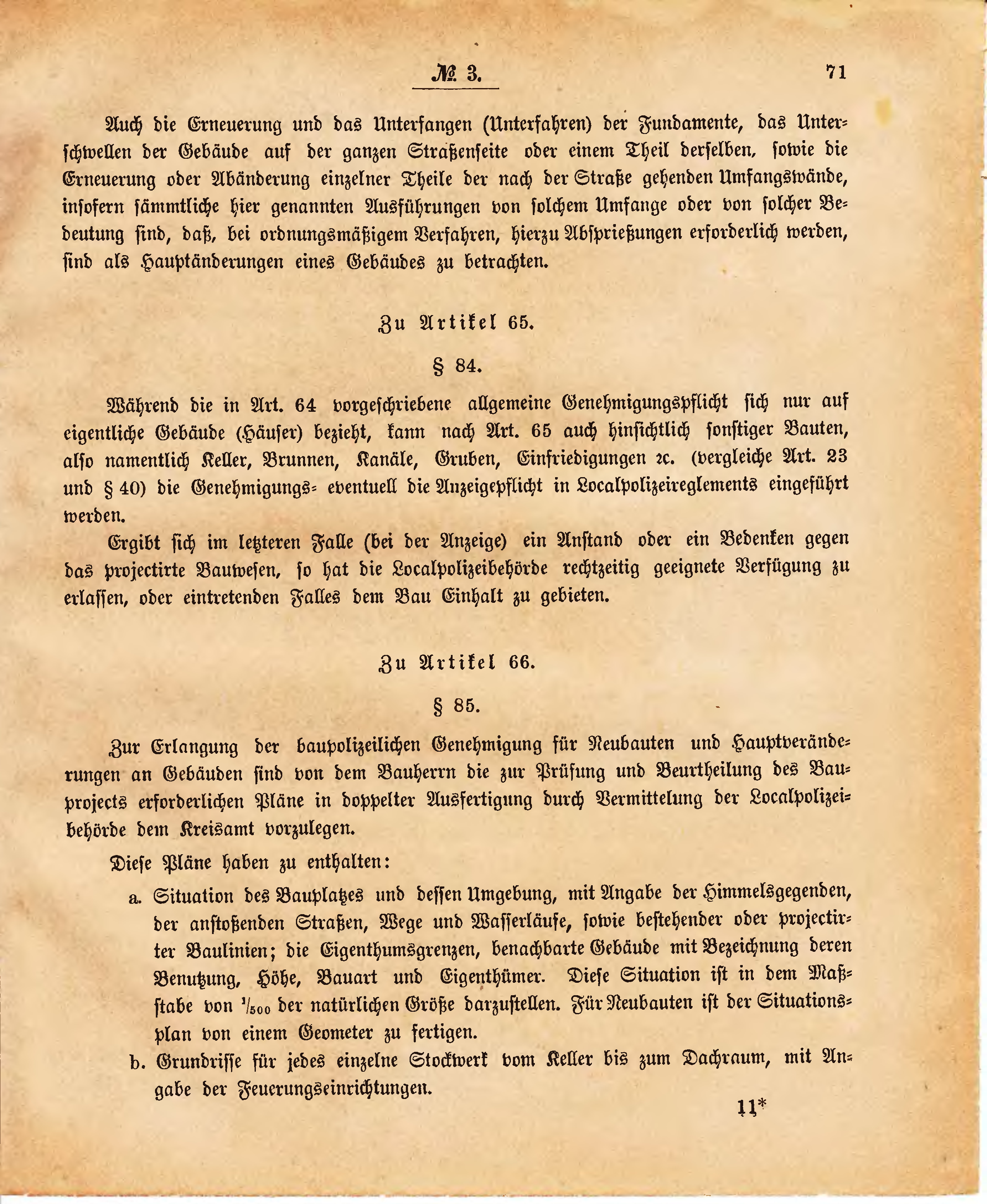 | a. | Situation des Bauplatzes und dessen Umgebung, mit Angabe der Himmelsgegenden, der anstoßenden Straßen, Wege und Wasserläufe, sowie bestehender oder projectirter Baulinien; die Eigenthumsgrenzen, benachbarte Gebäude mit Bezeichnung deren Benutzung, Höhe, Bauart und Eigenthümer. Diese Situation ist in dem Maßstabe von 1/500 der natürlichen Größe darzustellen. Für Neubauten ist der Situationsplan von einem Geometer zu fertigen. | |