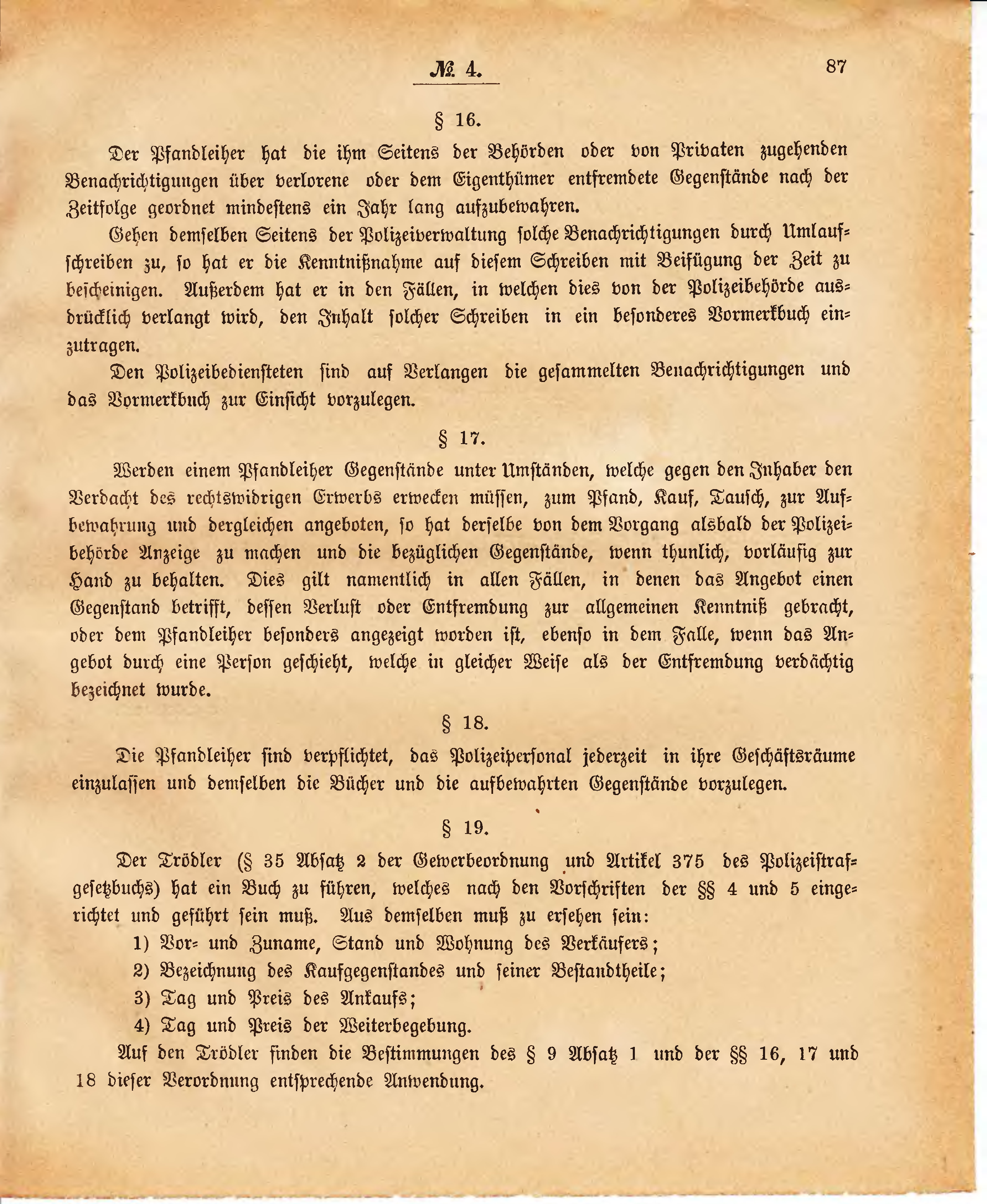 Der Trödler (§ 35 Absatz 2 der Gewerbeordnung und Artikel 375 des Polizeistrafgesetzbuchs) hat ein Buch zu führen, welches nach den Vorschriften der §§ 4 und 5 eingerichtet und geführt sein muß. Aus demselben muß zu ersehen sein: