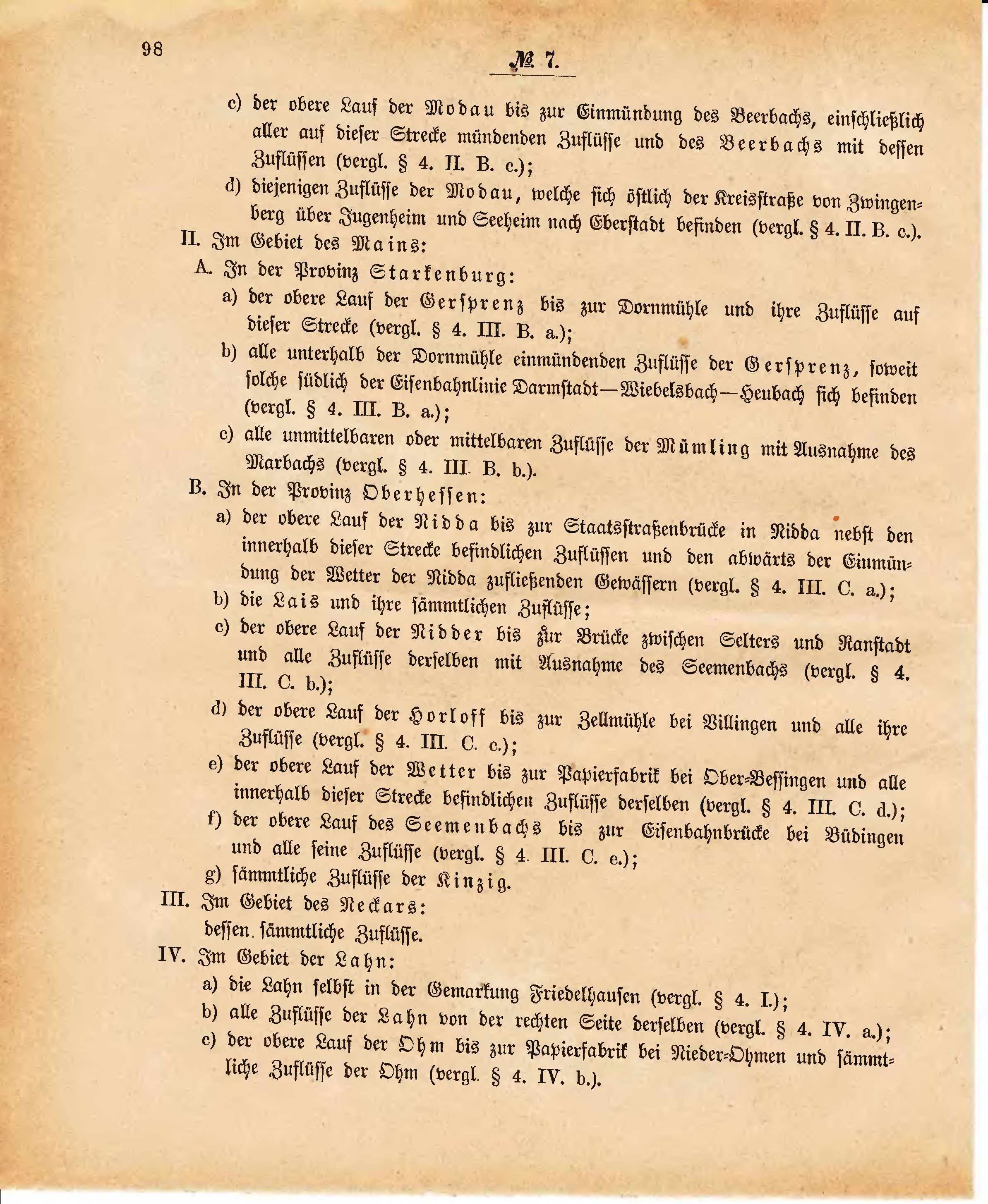 | e) | der obere Lauf der Wetter bis zur Papierfabrik bei Ober-Bessingen und alle innerhalb dieser Strecke befindlichen Zuflüsse derselben [vergl. § 4. III. C. d.); | |||