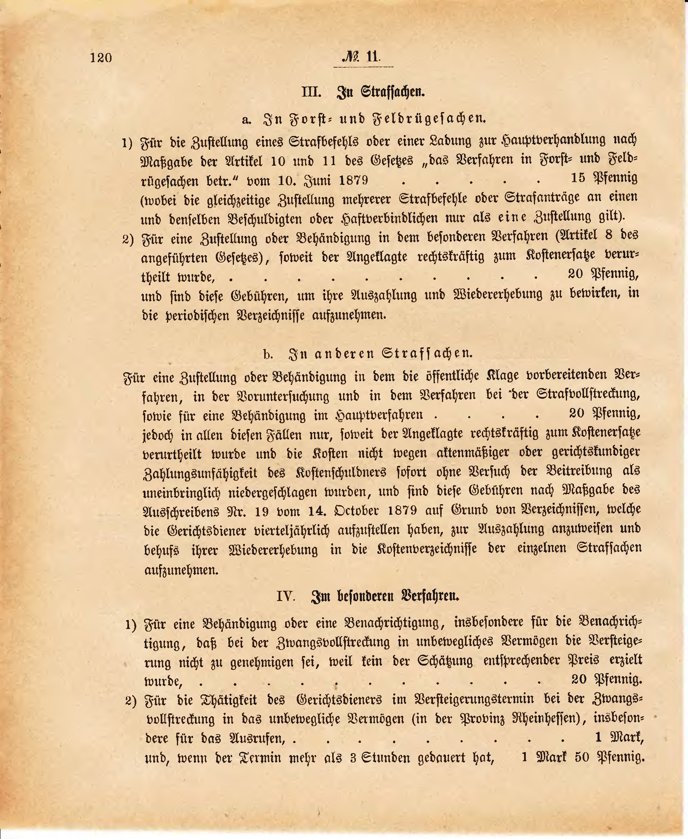 | 1) | Für die Zustellung eines Strafbefehls oder einer Ladung zur Hauptverhandlung nach Maßgabe der Artikel 10 und 11 des Gesetzes "das Verfahren in Forst- und Feldrügesachen betr." vom 10. Juni 1879 |