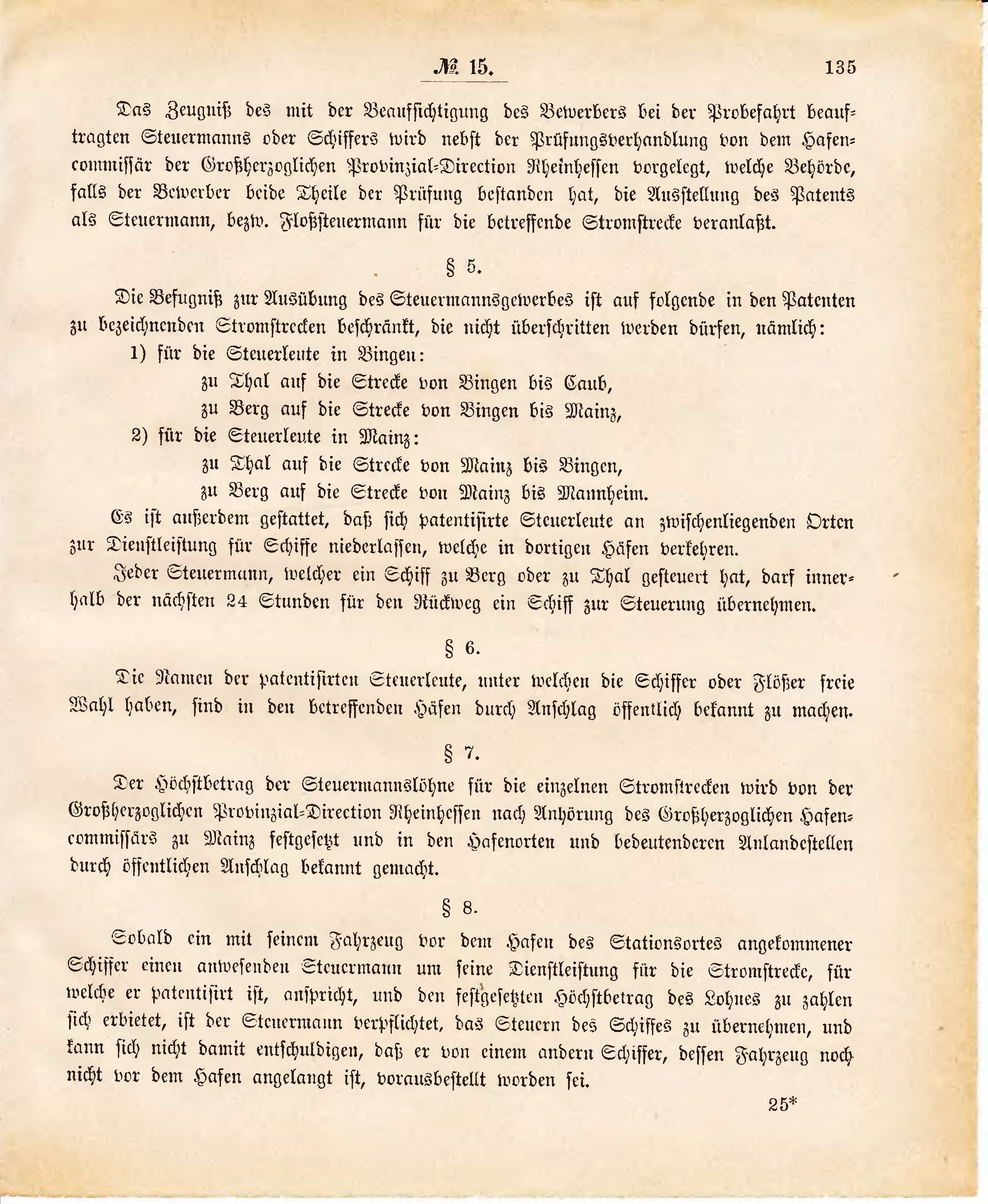 Der Höchstbetrag der Steuermannslöhne für die einzelnen Stromstrecken wird von der Großherzoglichen Provinzial-Direction Rheinhessen nach Anhörung des Großherzoglichen Hafencommissärs zu Mainz festgesetzt und in den Hafenorten und bedeutenderen Anlandestelle durch öffentlichen Anschlag bekannt gemacht.