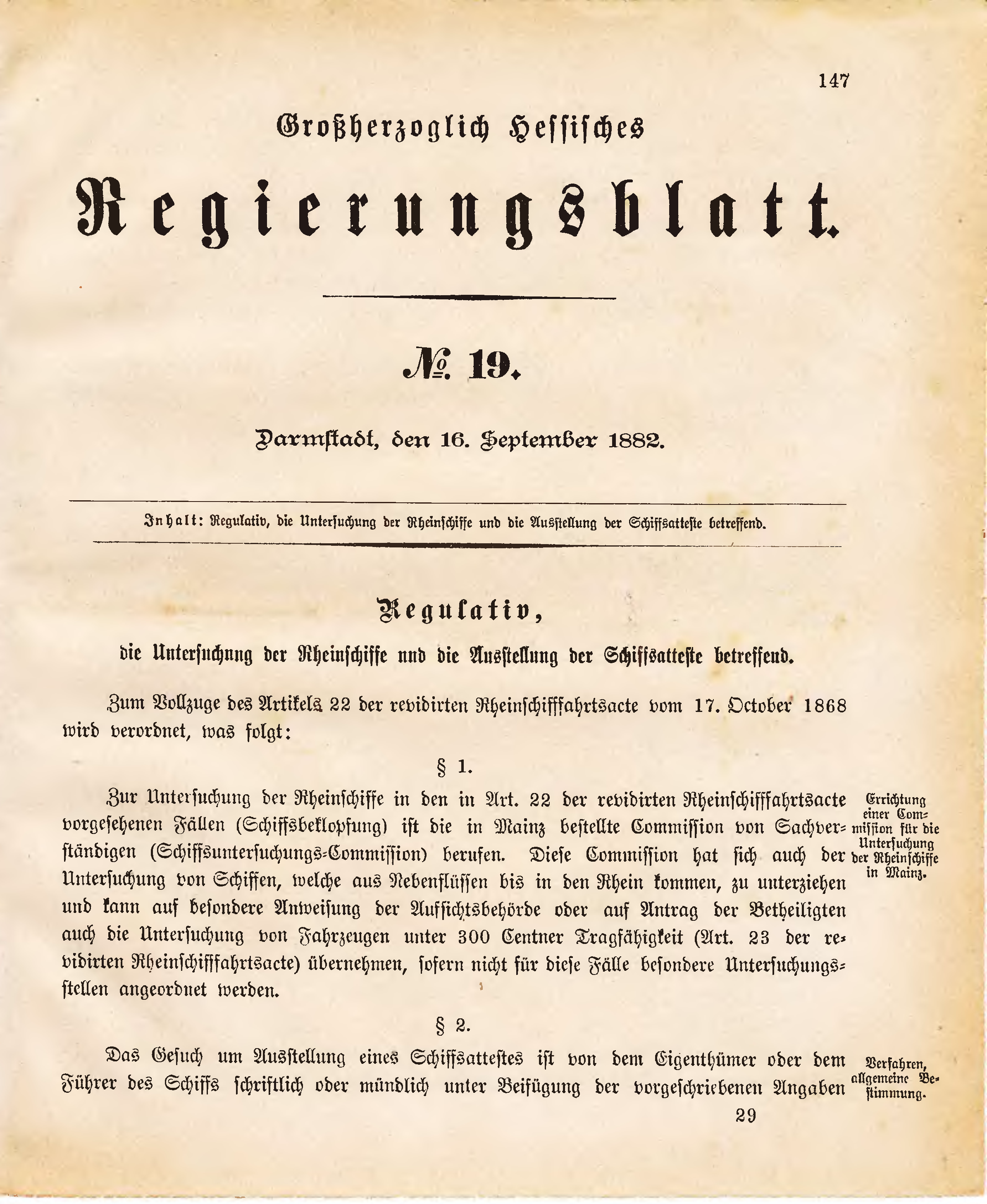 Inhalt: Regulativ, die Untersuchung der Rheinschiffe und die Ausstellung der Schiffsatteste betreffend.