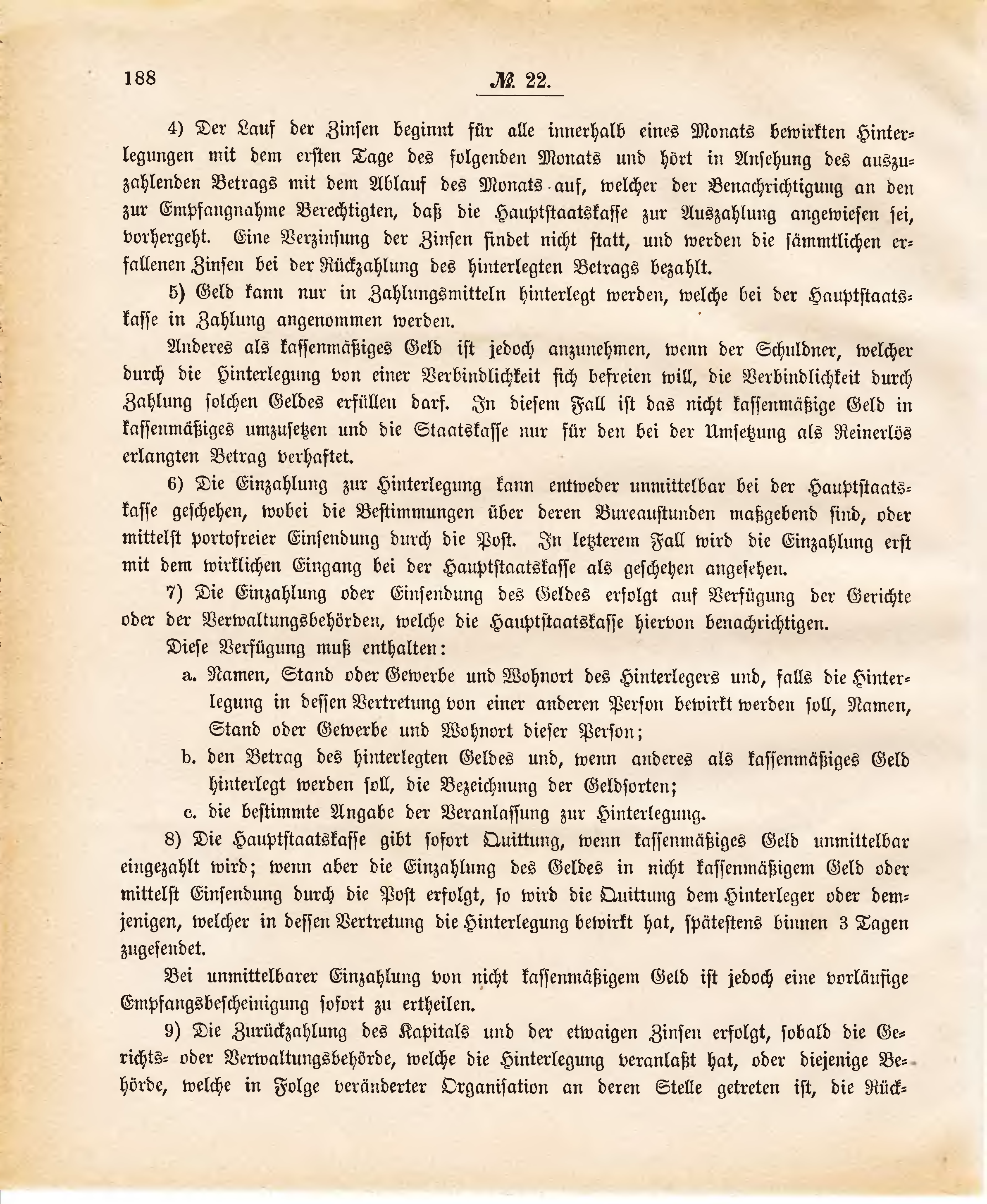 4) Der Lauf der Zinsen beginnt für alle innerhalb eines Monats bewirkten Hinterlegungen mit dem ersten Tage des folgenden Monats und hört in Ansehung des auszuzahlenden Betrags mit dem Ablauf des Monats auf, welcher der Benachrichtigung an den zur Empfangnahme Berechtigten, daß die Hauptstaatskasse zur Auszahlung angewiesen sei, vorhergeht. Eine Verzinsung der Zinsen findet nicht statt, und werden die sämmtlichen erfallenen Zinsen bei der Rückzahlung des hinterlegten Betrags bezahlt.