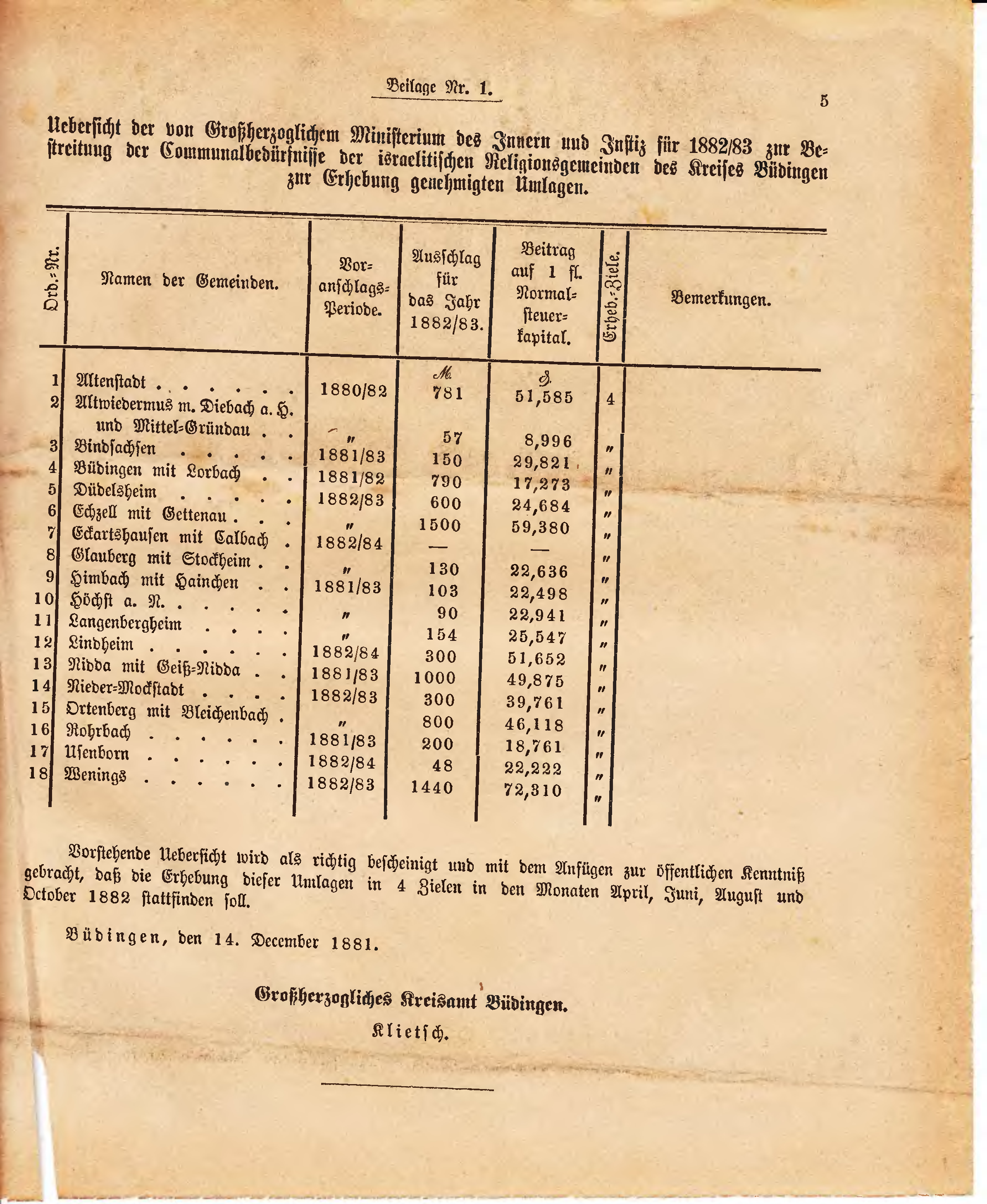 Uebersicht der von Großherzoglichem Ministerium des Innern und Justiz für 1882/83 zur Bestreitung der Communalbedürfnisse der israelitischen Religionsgemeinden des Kreisen Büdingen zur Erhebung genehmigten Umlagen.